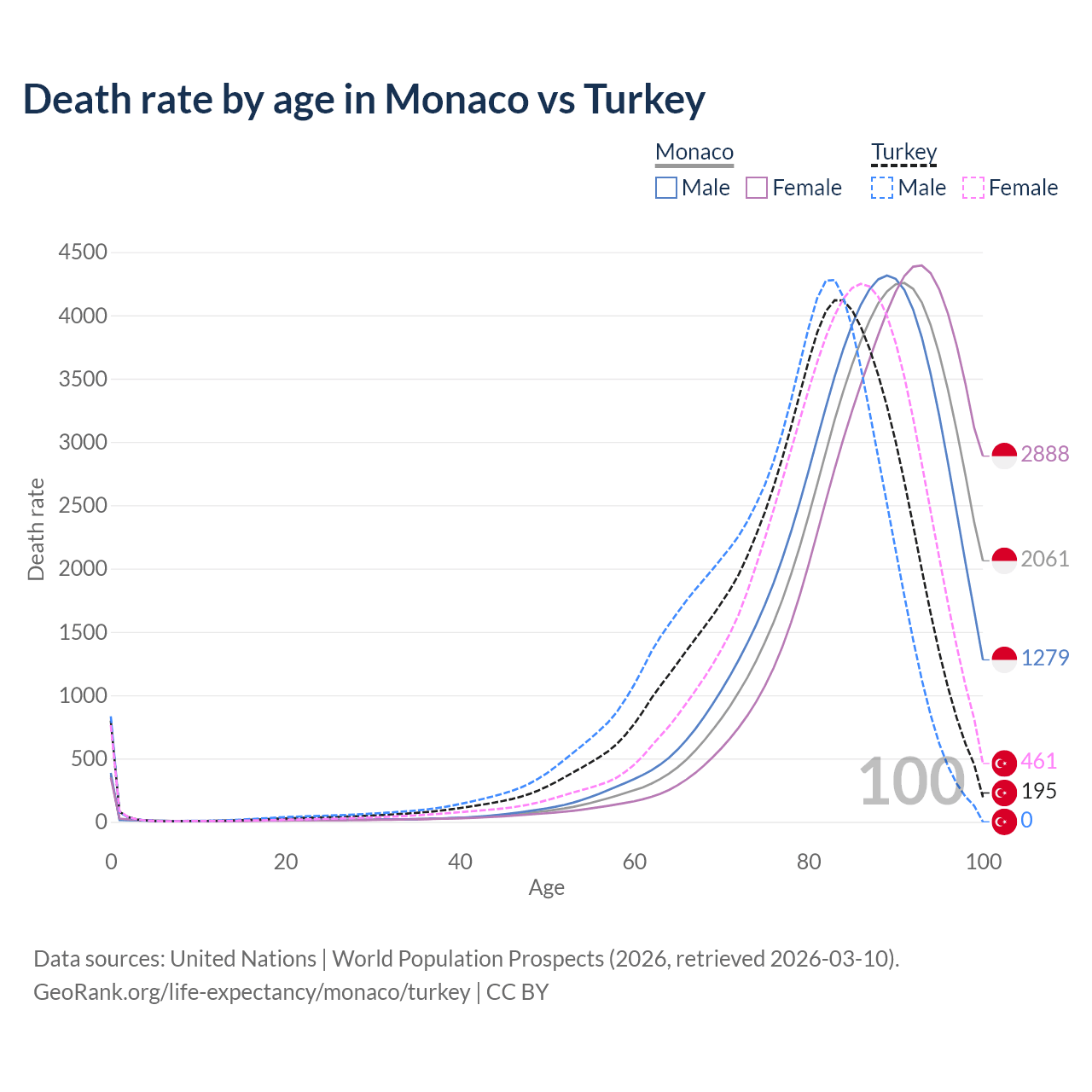 In Monaco, the most common age of death is 91, compared to 83 in Turkey. The median age of death is 88.7 in Monaco and 81.4 in Turkey, meaning only half of each cohort is expected to live past that age.