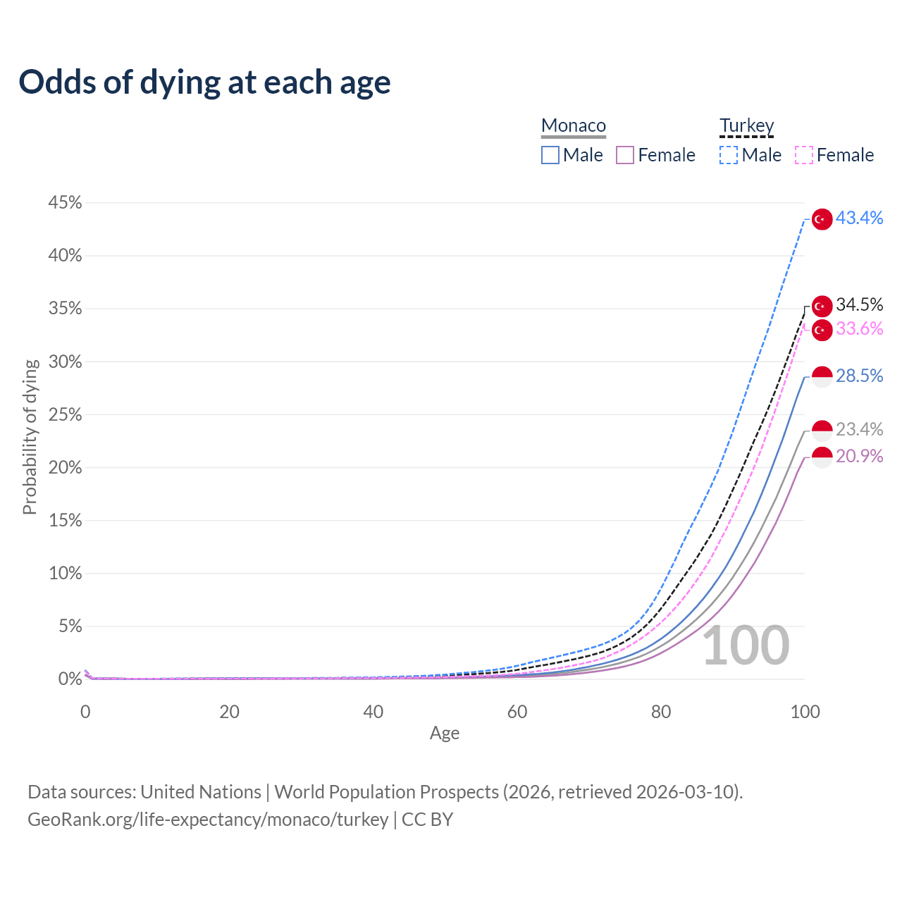 This life expectancy calculator shows the odds of living to 100, 95, 90, and below based on current age for both males and females in Monaco and Turkey, along with mean and median age of death. The calculations are based on the 2026 life tables (actuarial tables) from the UN World Population Prospects.