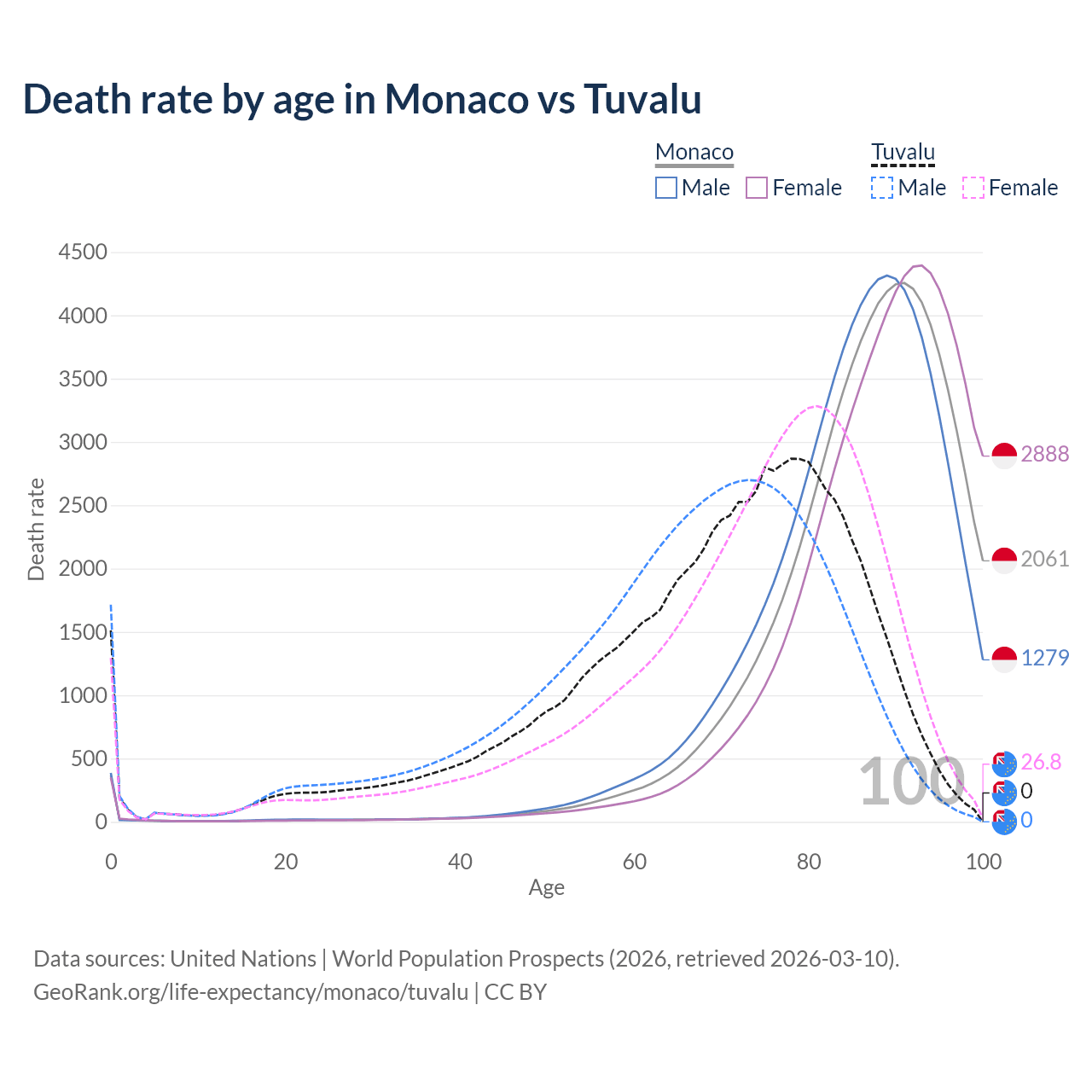 In Monaco, the most common age of death is 91, compared to 78 in Tuvalu. The median age of death is 88.7 in Monaco and 71.9 in Tuvalu, meaning only half of each cohort is expected to live past that age.