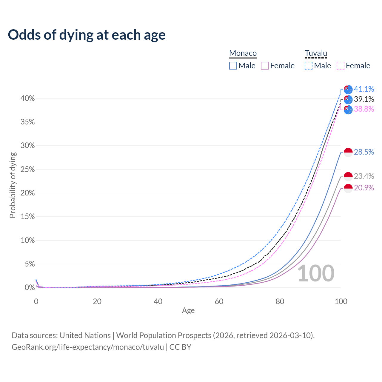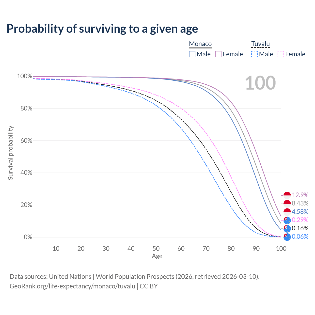 This life expectancy calculator shows the odds of living to 100, 95, 90, and below based on current age for both males and females in Monaco and Tuvalu, along with mean and median age of death. The calculations are based on the 2026 life tables (actuarial tables) from the UN World Population Prospects.