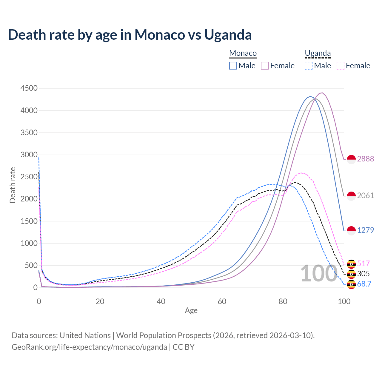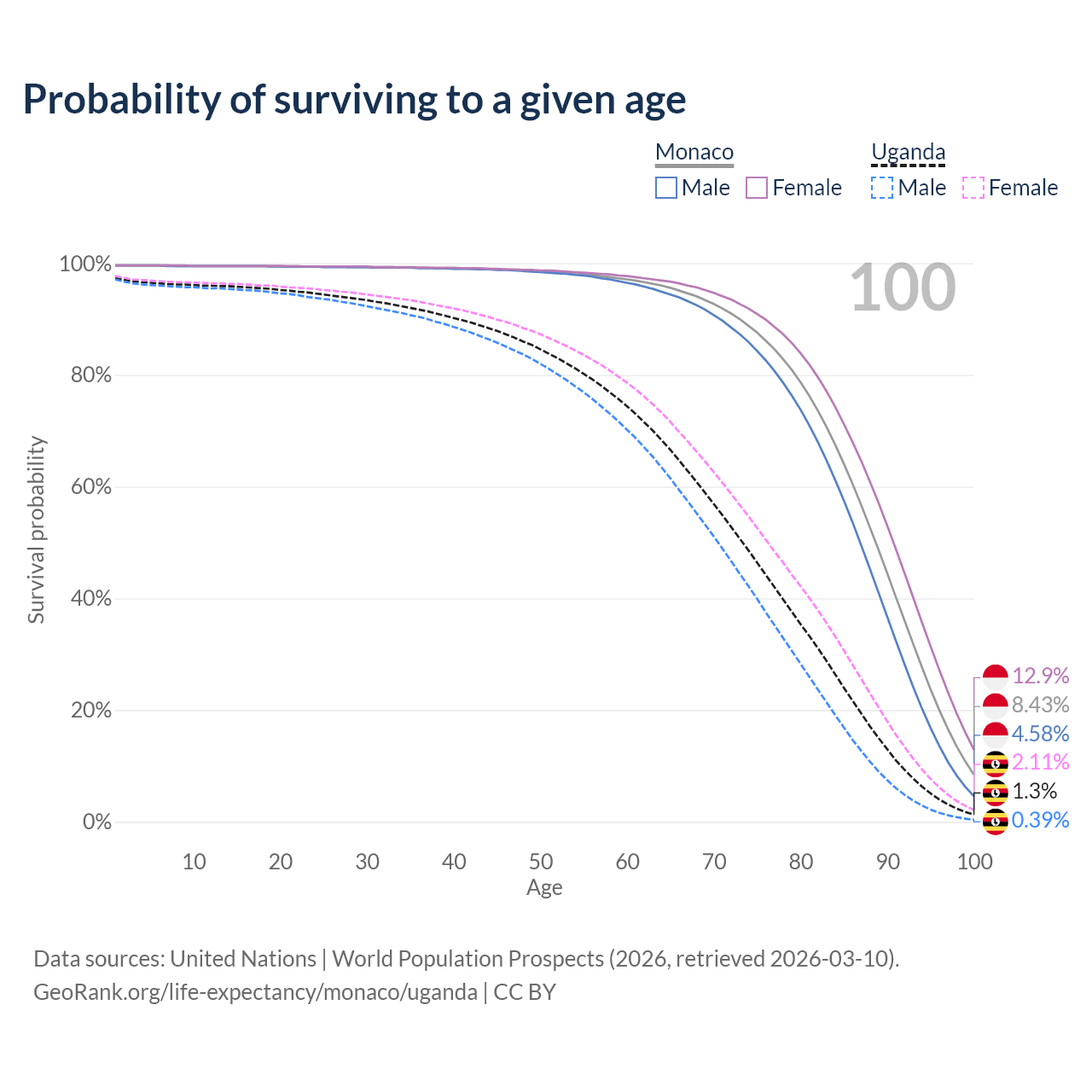 This life expectancy calculator shows the odds of living to 100, 95, 90, and below based on current age for both males and females in Monaco and Uganda, along with mean and median age of death. The calculations are based on the 2026 life tables (actuarial tables) from the UN World Population Prospects.
