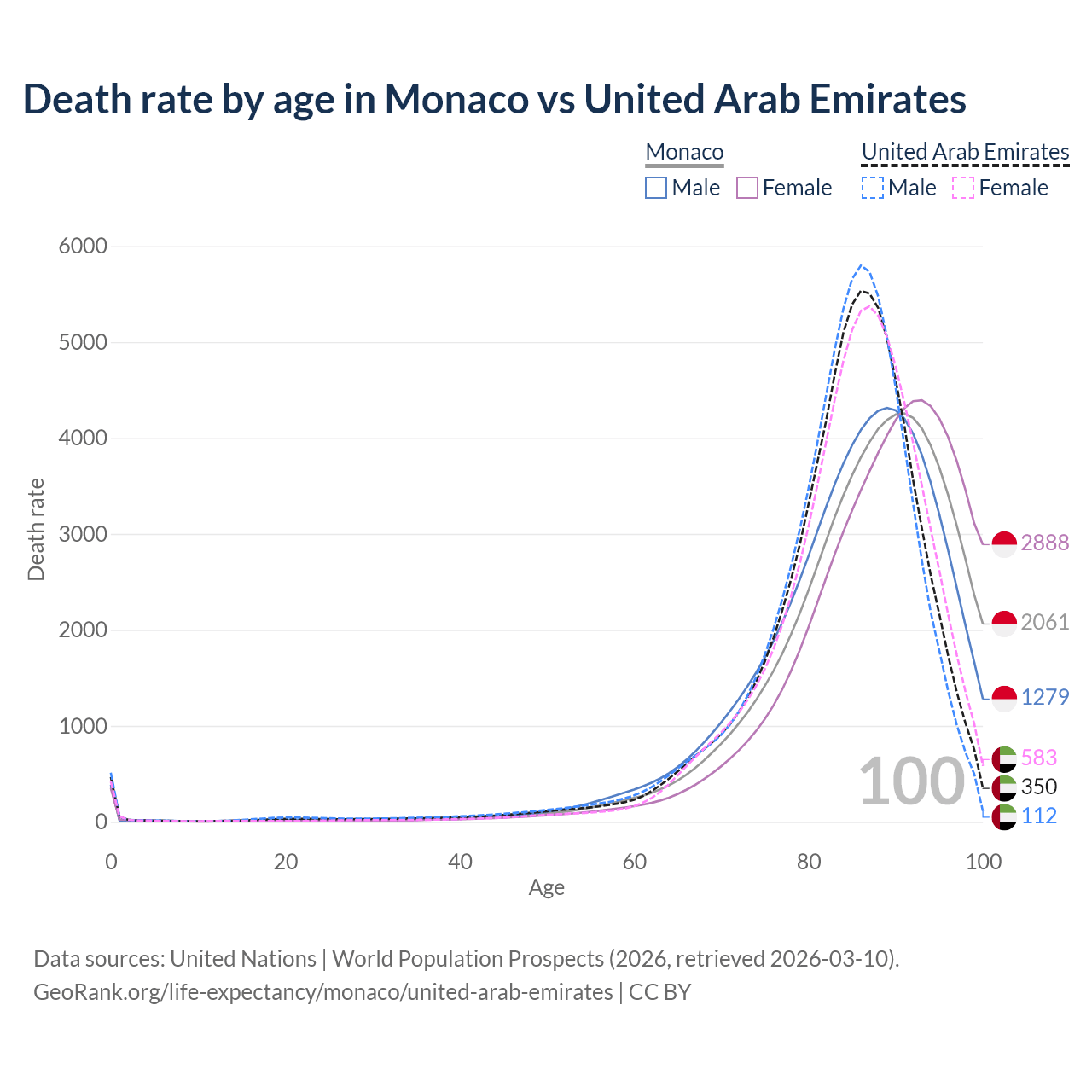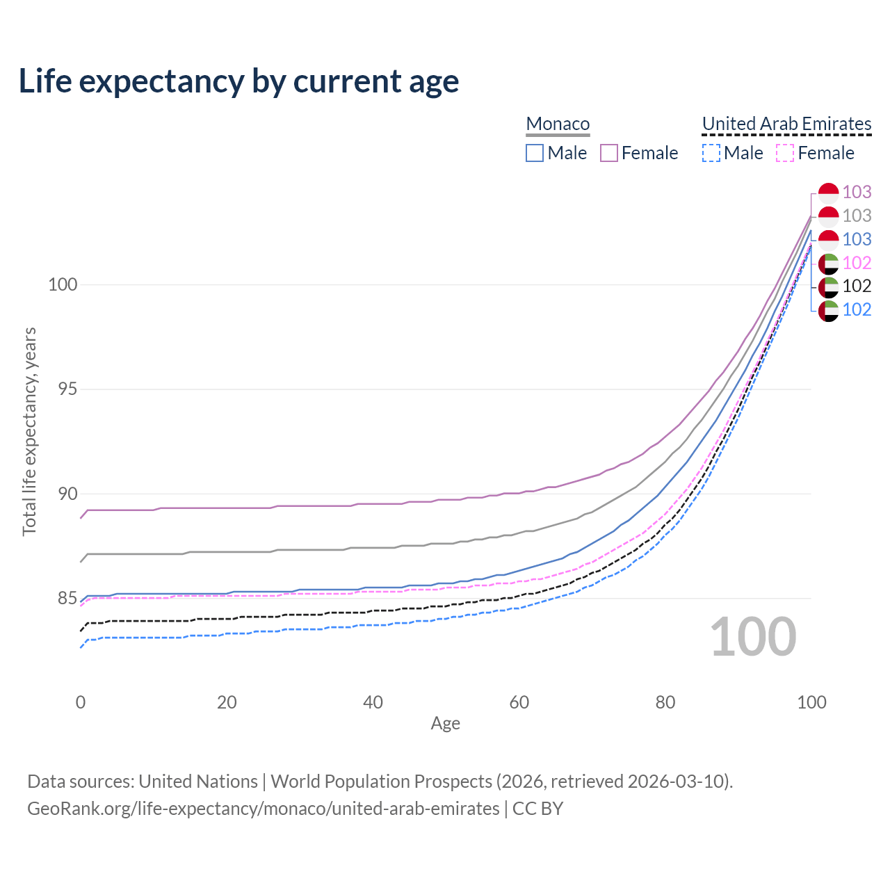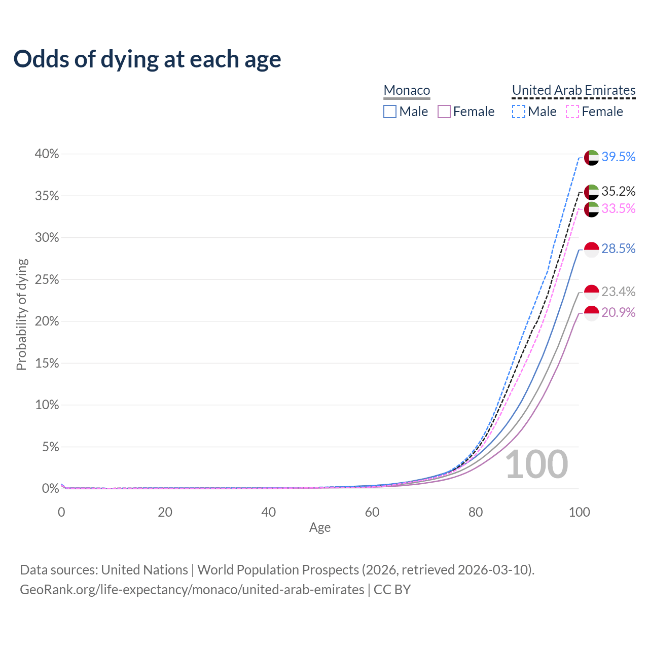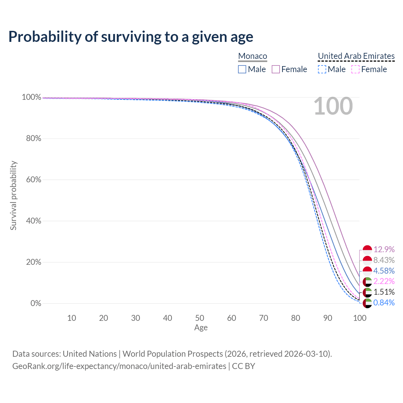 This life expectancy calculator shows the odds of living to 100, 95, 90, and below based on current age for both males and females in Monaco and the United Arab Emirates, along with mean and median age of death. The calculations are based on the 2026 life tables (actuarial tables) from the UN World Population Prospects.