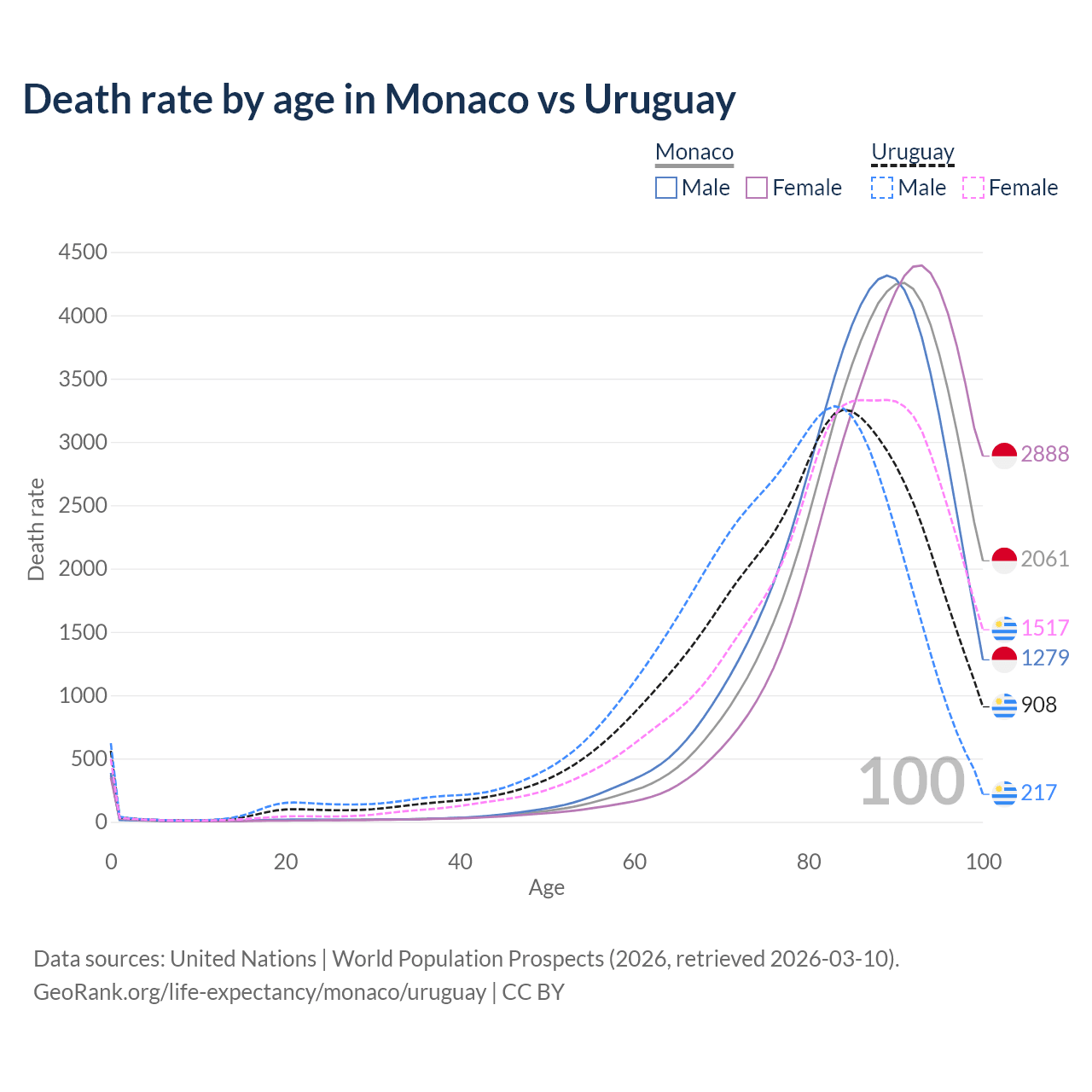 In Monaco, the most common age of death is 91, compared to 84 in Uruguay. The median age of death is 88.7 in Monaco and 81.8 in Uruguay, meaning only half of each cohort is expected to live past that age.