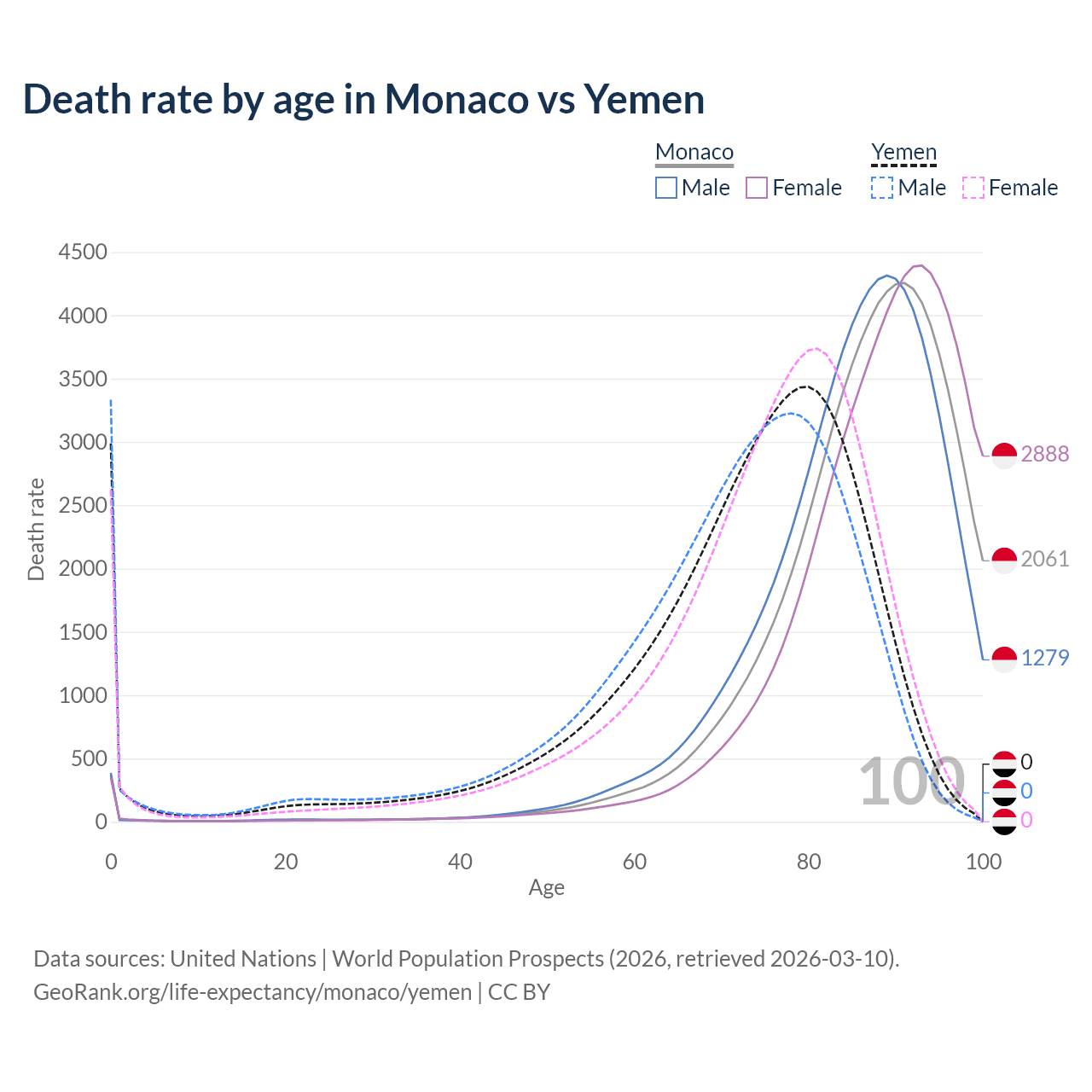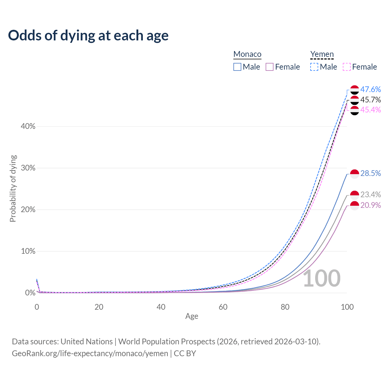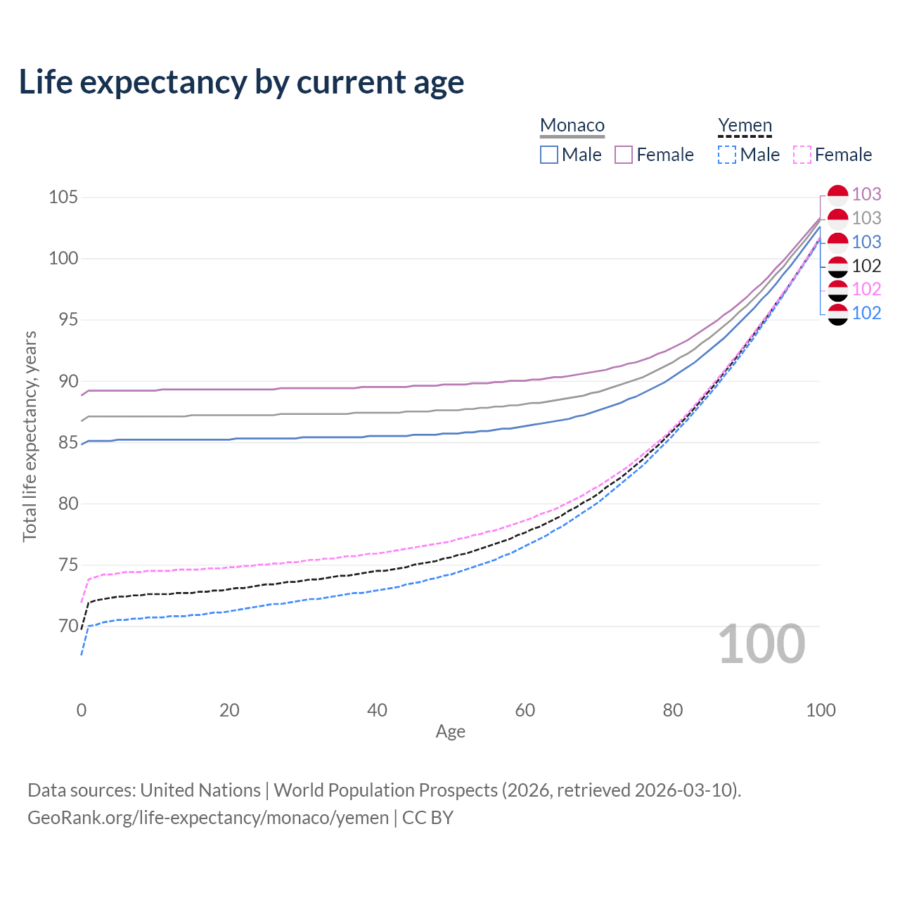This life expectancy calculator shows the odds of living to 100, 95, 90, and below based on current age for both males and females in Monaco and Yemen, along with mean and median age of death. The calculations are based on the 2026 life tables (actuarial tables) from the UN World Population Prospects.
