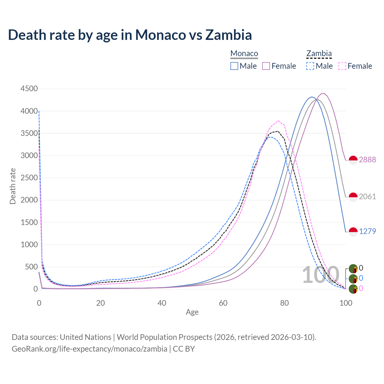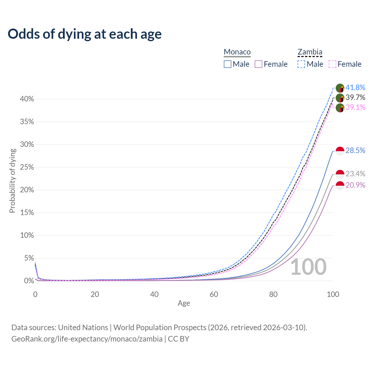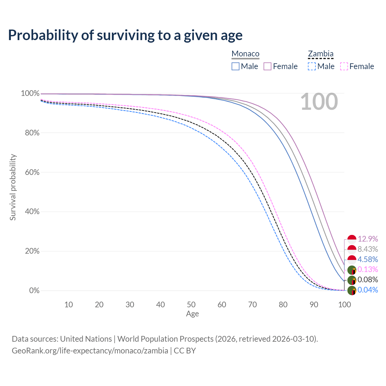 This life expectancy calculator shows the odds of living to 100, 95, 90, and below based on current age for both males and females in Monaco and Zambia, along with mean and median age of death. The calculations are based on the 2026 life tables (actuarial tables) from the UN World Population Prospects.