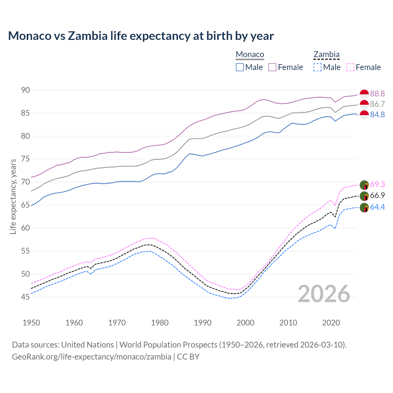 The average life expectancy at birth is 86.7 years in Monaco vs 66.9 in Zambia. Monaco is ranked 1/197 by life expectancy, and Zambia is 161/197. In Monaco, the life expectancy is 84.8 years for males and 88.8 years for females. In Zambia, it's 64.4 years for males and 69.3 years for females.