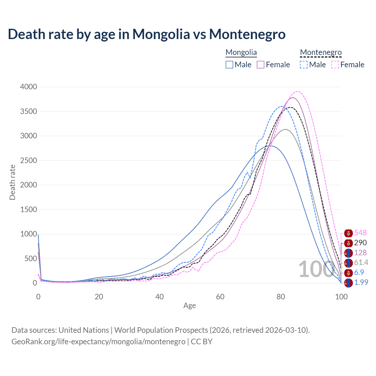 In Mongolia, the most common age of death is 82, compared to 83 in Montenegro. The median age of death is 76 in Mongolia and 80.1 in Montenegro, meaning only half of each cohort is expected to live past that age.