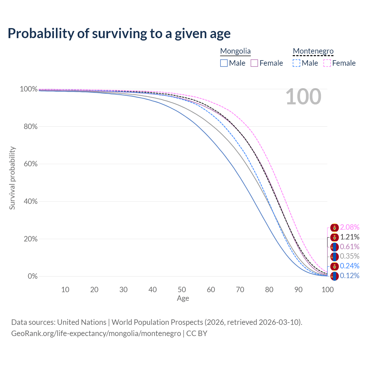 This life expectancy calculator shows the odds of living to 100, 95, 90, and below based on current age for both males and females in Mongolia and Montenegro, along with mean and median age of death. The calculations are based on the 2026 life tables (actuarial tables) from the UN World Population Prospects.
