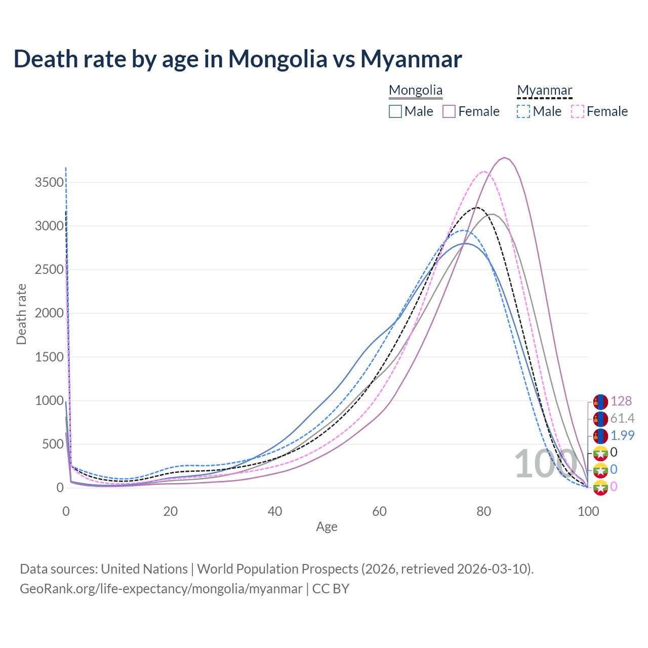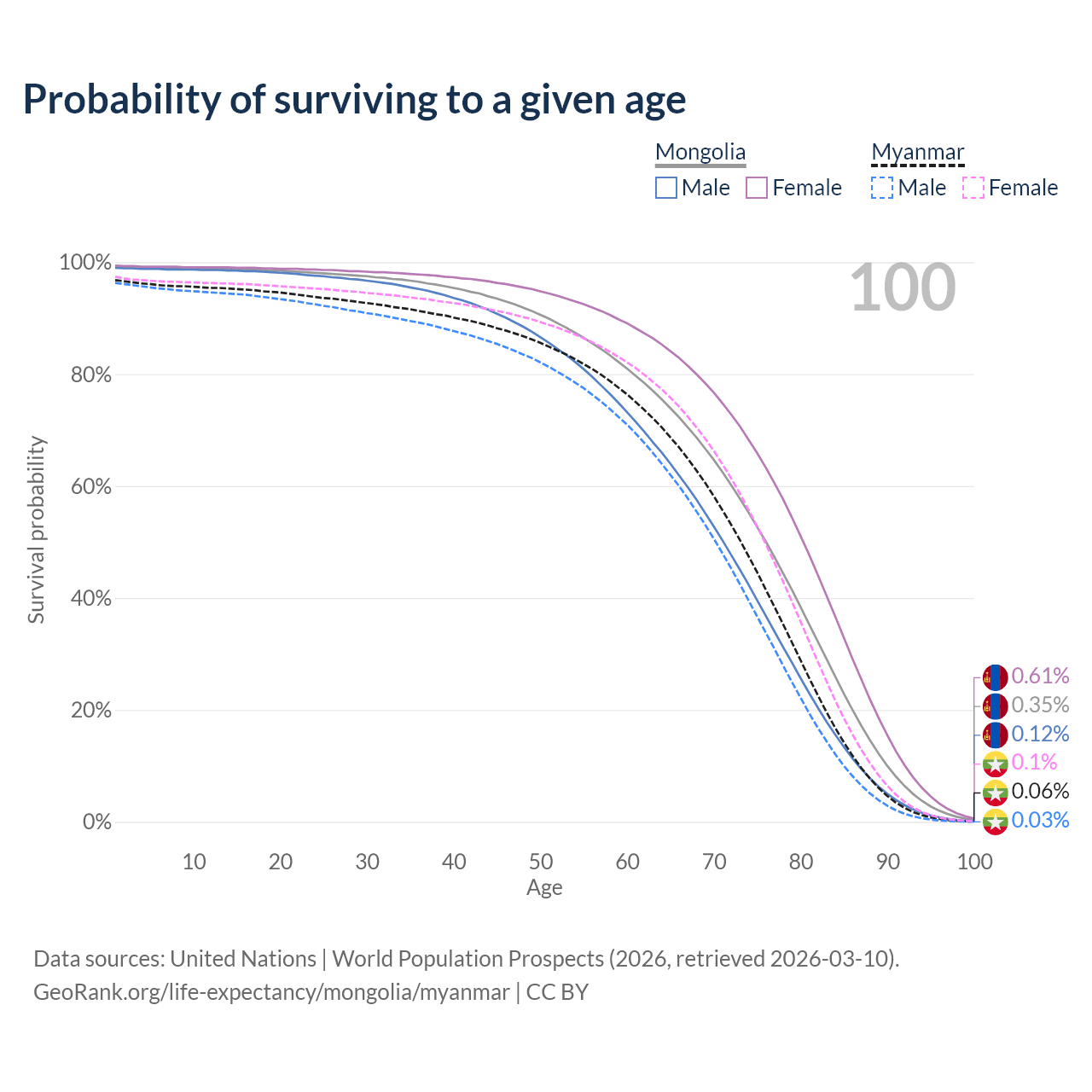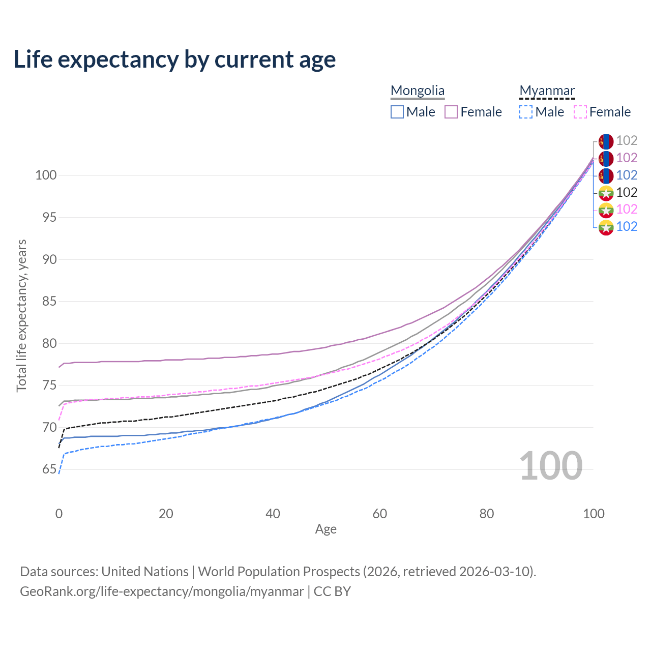 This life expectancy calculator shows the odds of living to 100, 95, 90, and below based on current age for both males and females in Mongolia and Myanmar, along with mean and median age of death. The calculations are based on the 2026 life tables (actuarial tables) from the UN World Population Prospects.