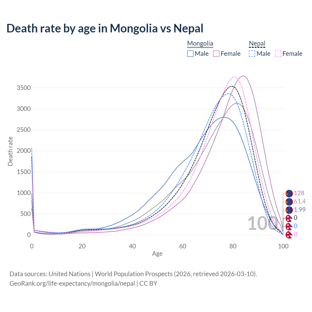 In Mongolia, the most common age of death is 82, compared to 80 in Nepal. The median age of death is 76 in Mongolia and 75.4 in Nepal, meaning only half of each cohort is expected to live past that age.