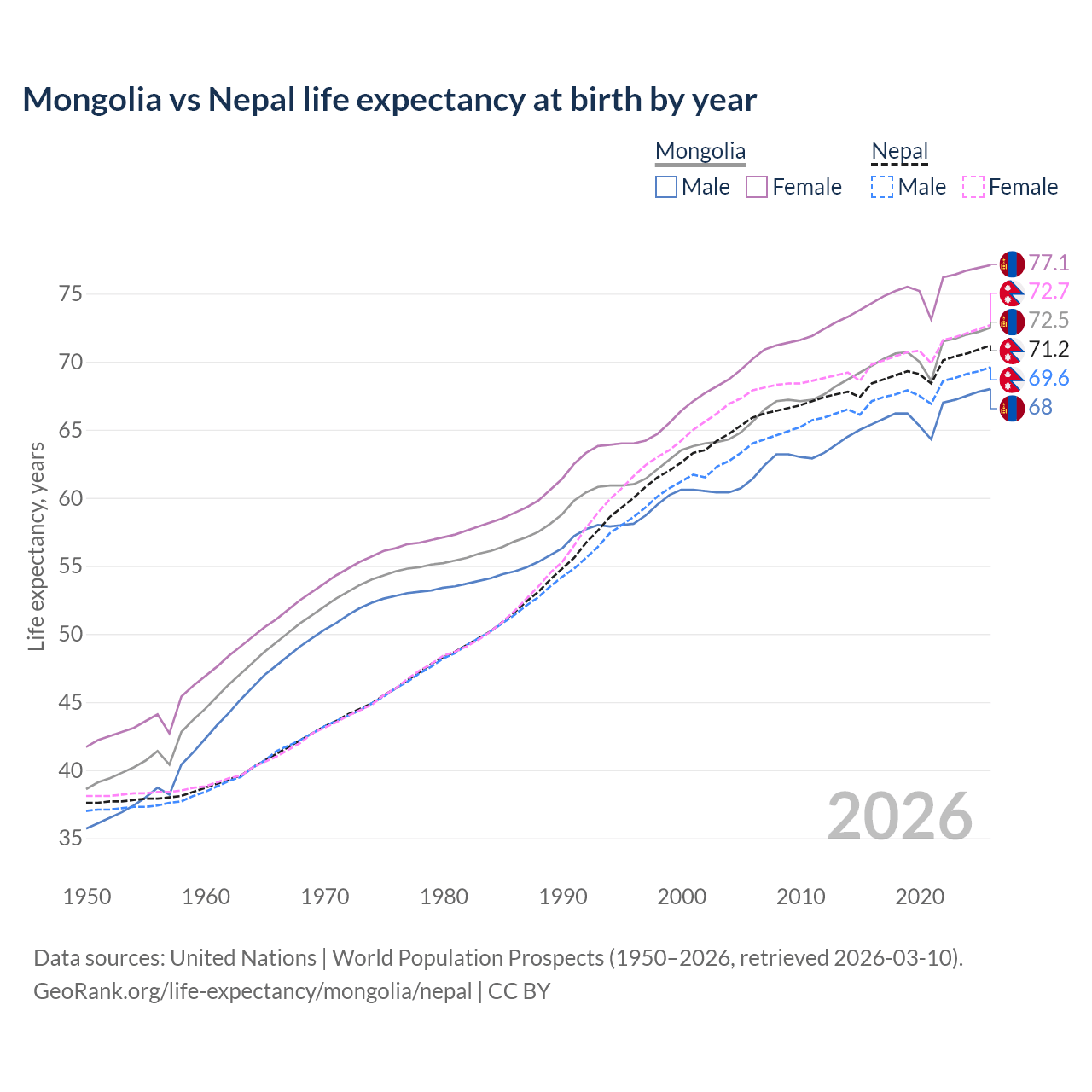 The average life expectancy at birth is 72.5 years in Mongolia vs 71.2 in Nepal. Mongolia is ranked 120/197 by life expectancy, and Nepal is 131/197. In Mongolia, the life expectancy is 68 years for males and 77.1 years for females. In Nepal, it's 69.6 years for males and 72.7 years for females.