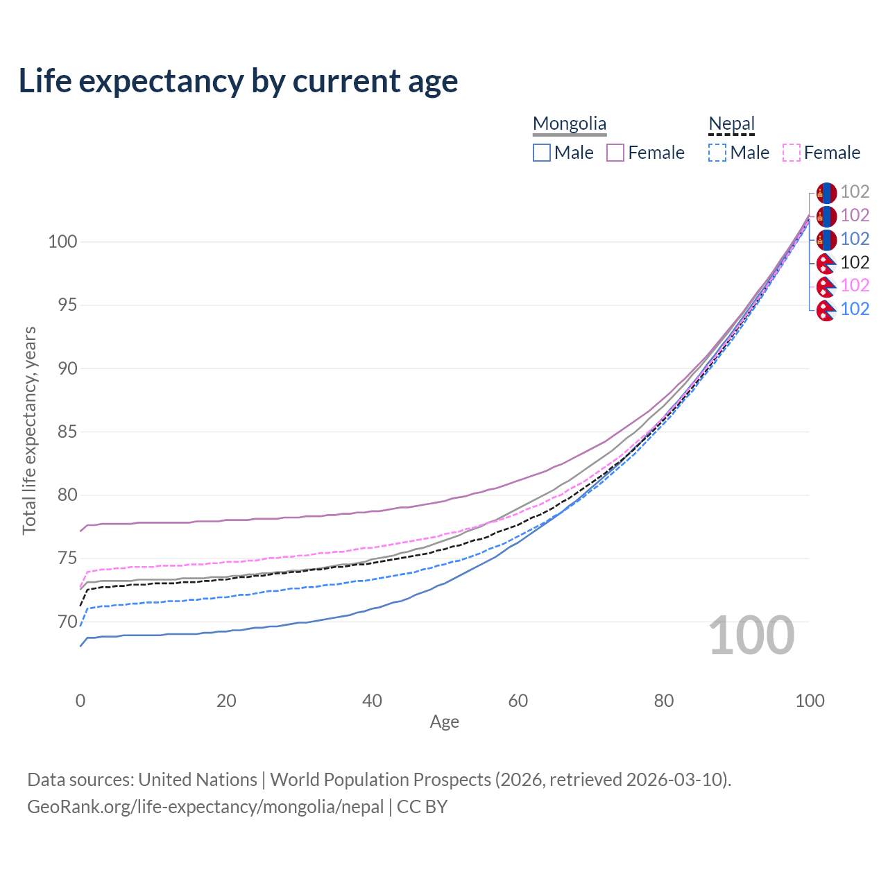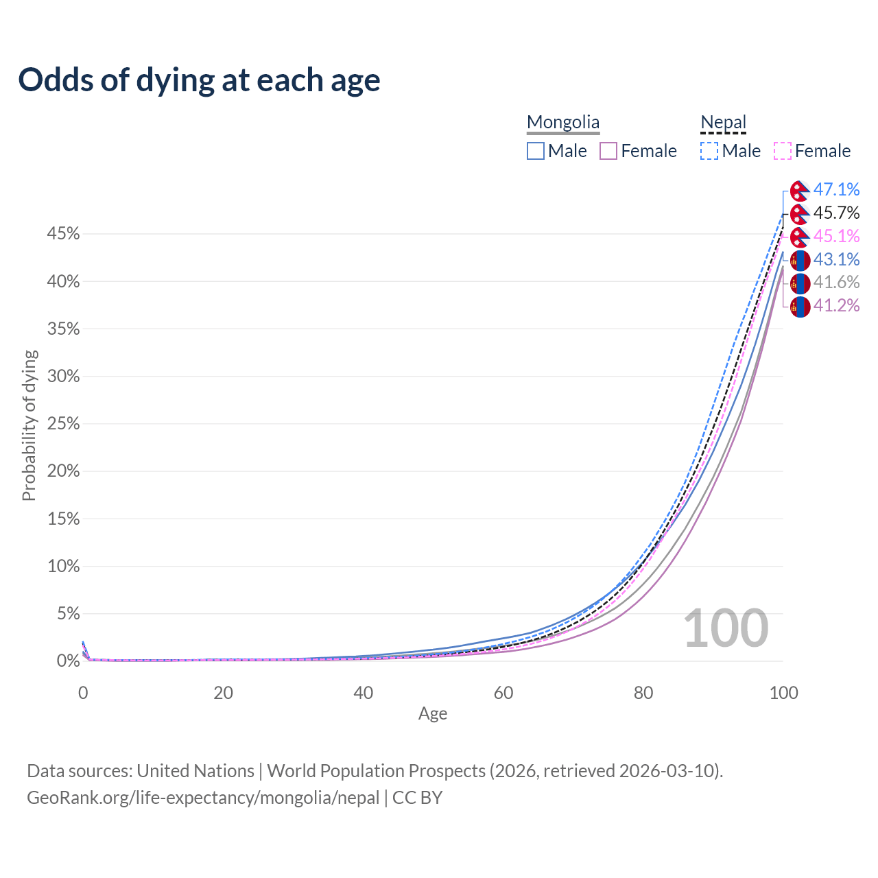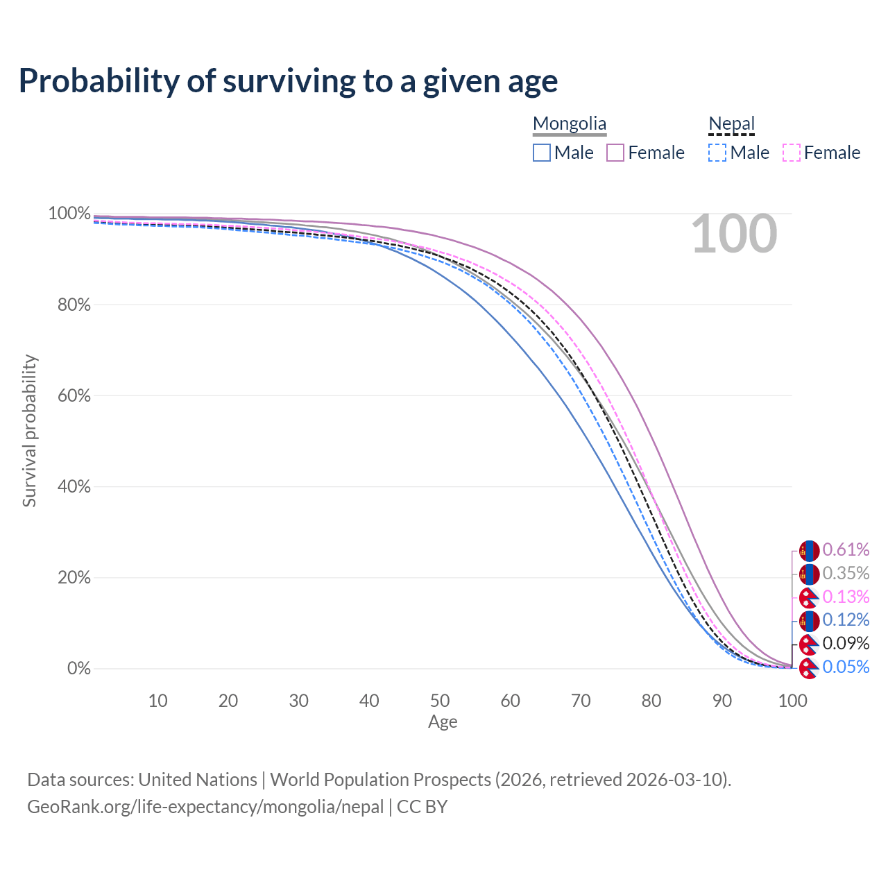 This life expectancy calculator shows the odds of living to 100, 95, 90, and below based on current age for both males and females in Mongolia and Nepal, along with mean and median age of death. The calculations are based on the 2026 life tables (actuarial tables) from the UN World Population Prospects.
