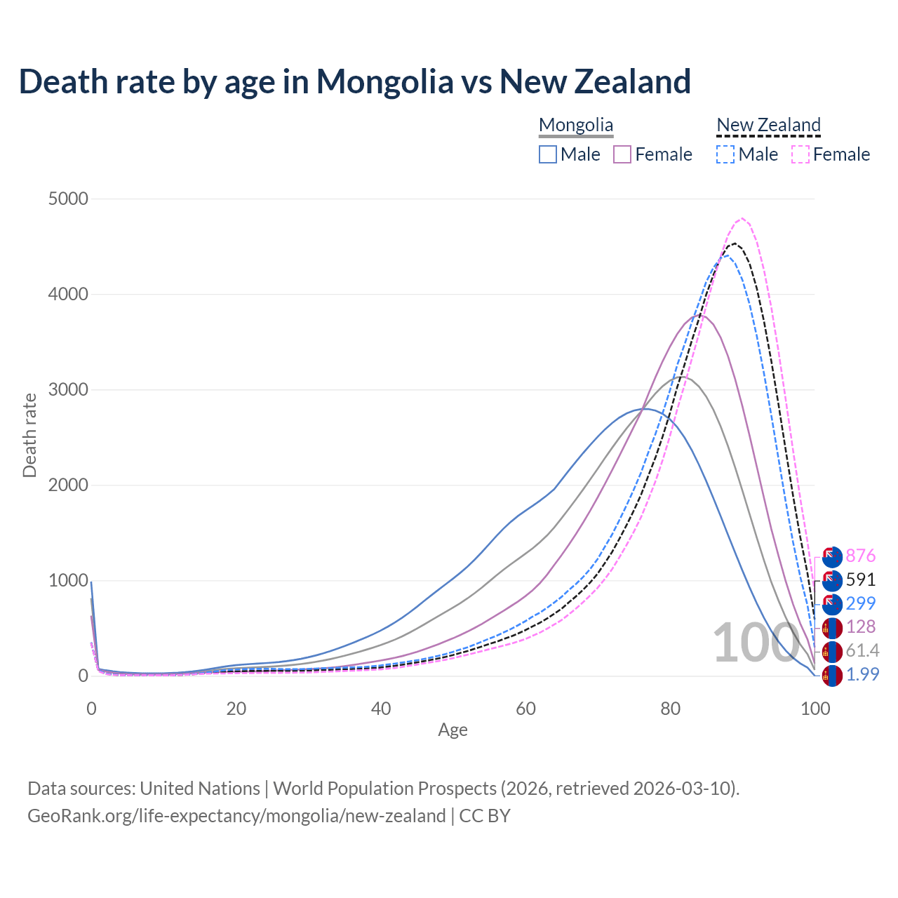 In Mongolia, the most common age of death is 82, compared to 89 in New Zealand. The median age of death is 76 in Mongolia and 85.8 in New Zealand, meaning only half of each cohort is expected to live past that age.