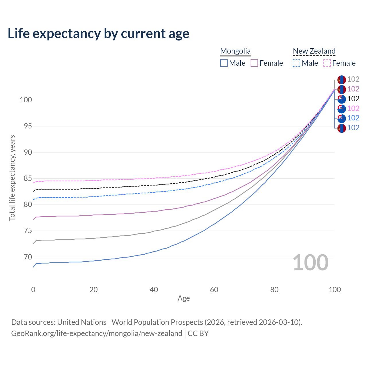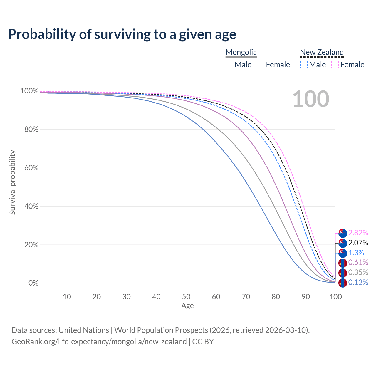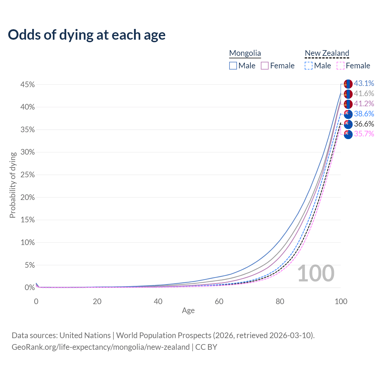 This life expectancy calculator shows the odds of living to 100, 95, 90, and below based on current age for both males and females in Mongolia and New Zealand, along with mean and median age of death. The calculations are based on the 2026 life tables (actuarial tables) from the UN World Population Prospects.