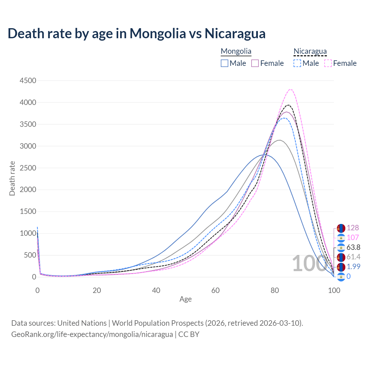 In Mongolia, the most common age of death is 82, compared to 85 in Nicaragua. The median age of death is 76 in Mongolia and 79.9 in Nicaragua, meaning only half of each cohort is expected to live past that age.