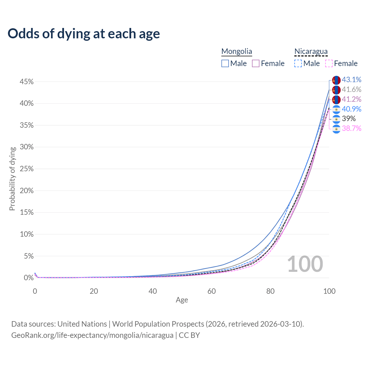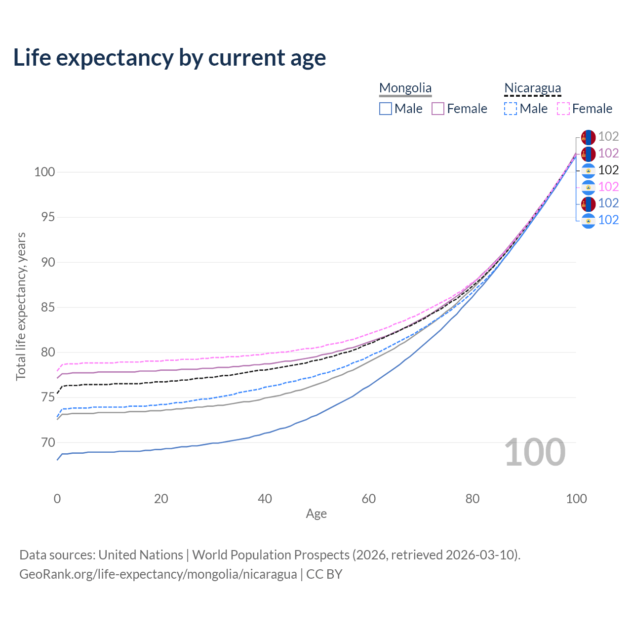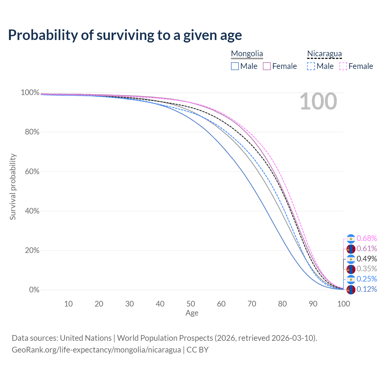 This life expectancy calculator shows the odds of living to 100, 95, 90, and below based on current age for both males and females in Mongolia and Nicaragua, along with mean and median age of death. The calculations are based on the 2026 life tables (actuarial tables) from the UN World Population Prospects.