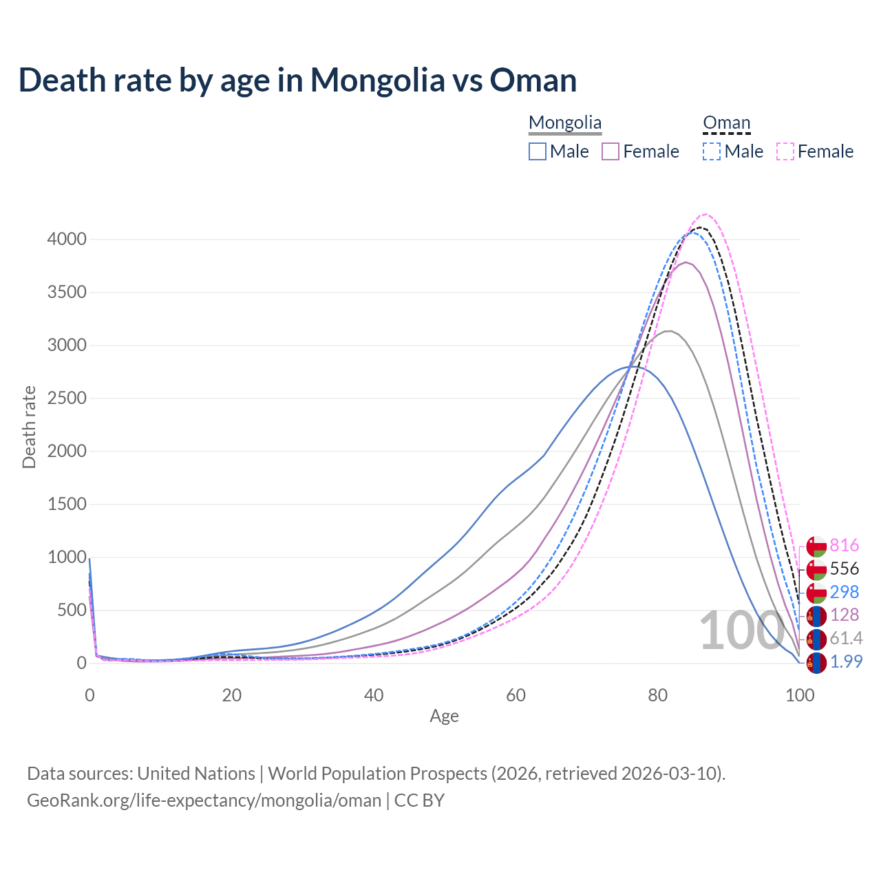In Mongolia, the most common age of death is 82, compared to 86 in Oman. The median age of death is 76 in Mongolia and 83.5 in Oman, meaning only half of each cohort is expected to live past that age.