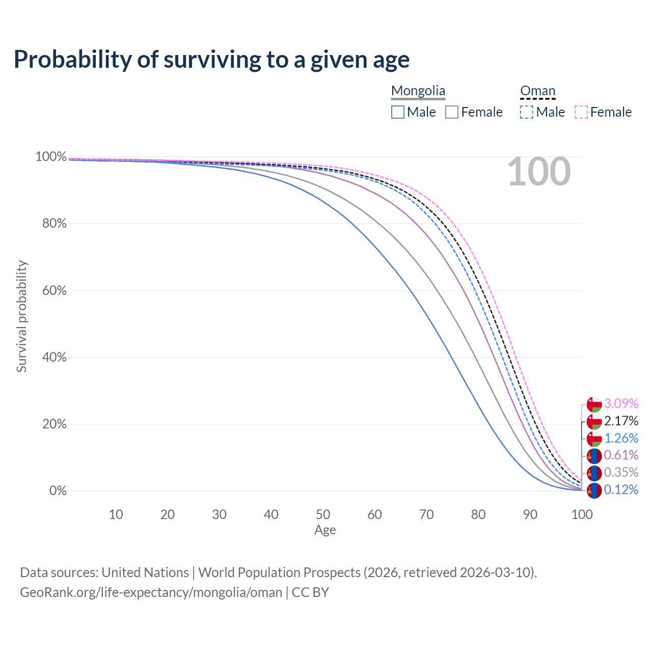 This life expectancy calculator shows the odds of living to 100, 95, 90, and below based on current age for both males and females in Mongolia and Oman, along with mean and median age of death. The calculations are based on the 2026 life tables (actuarial tables) from the UN World Population Prospects.