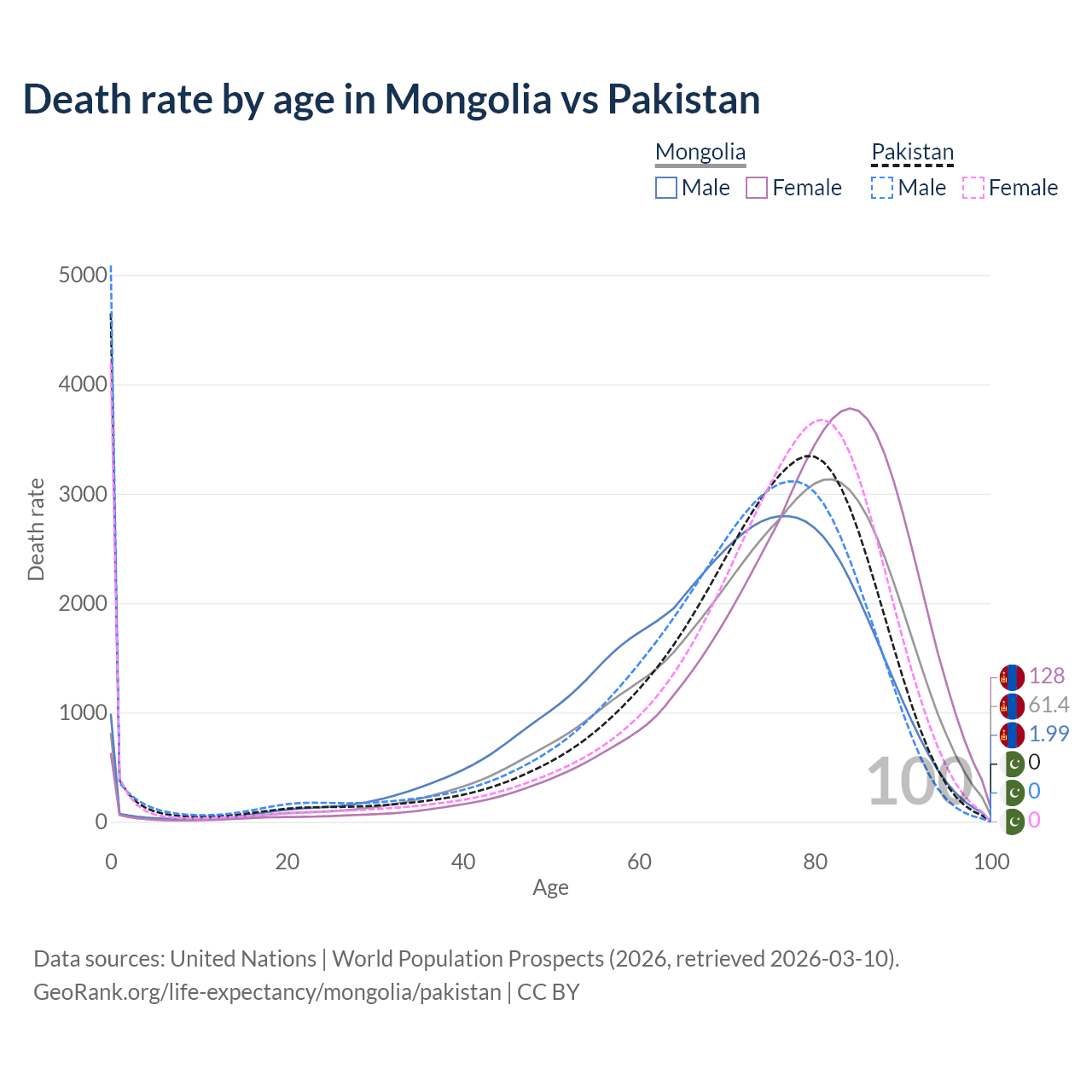 In Mongolia, the most common age of death is 82, compared to 0 in Pakistan. The median age of death is 76 in Mongolia and 74.3 in Pakistan, meaning only half of each cohort is expected to live past that age.