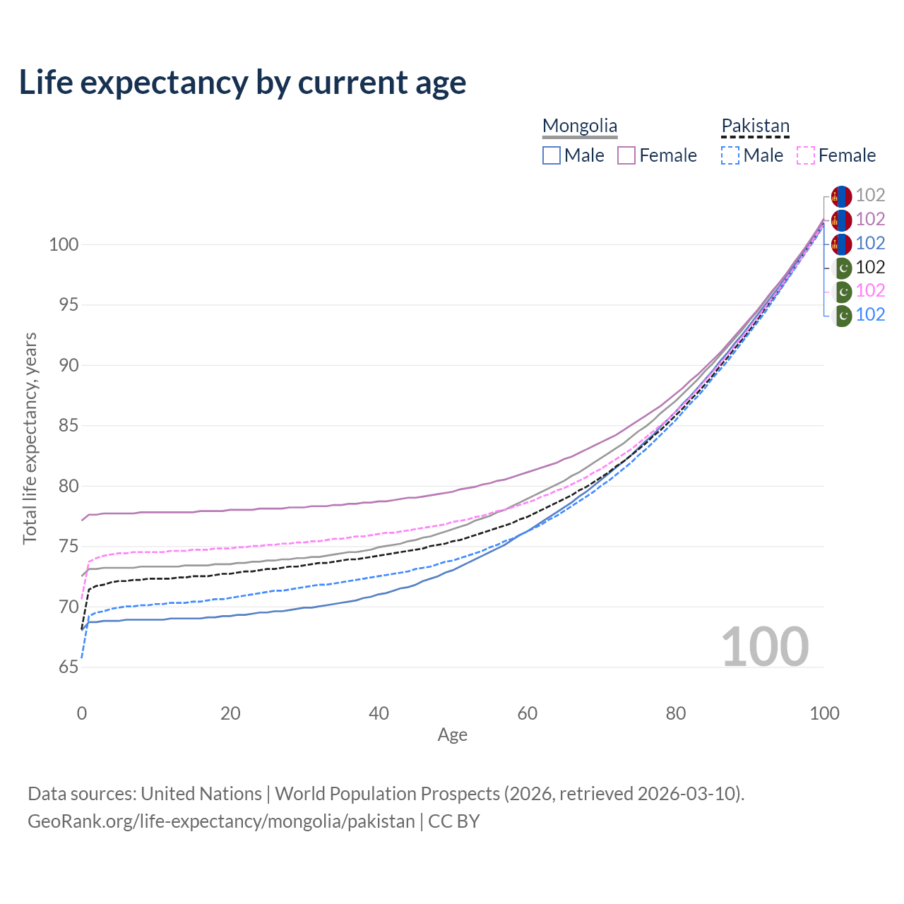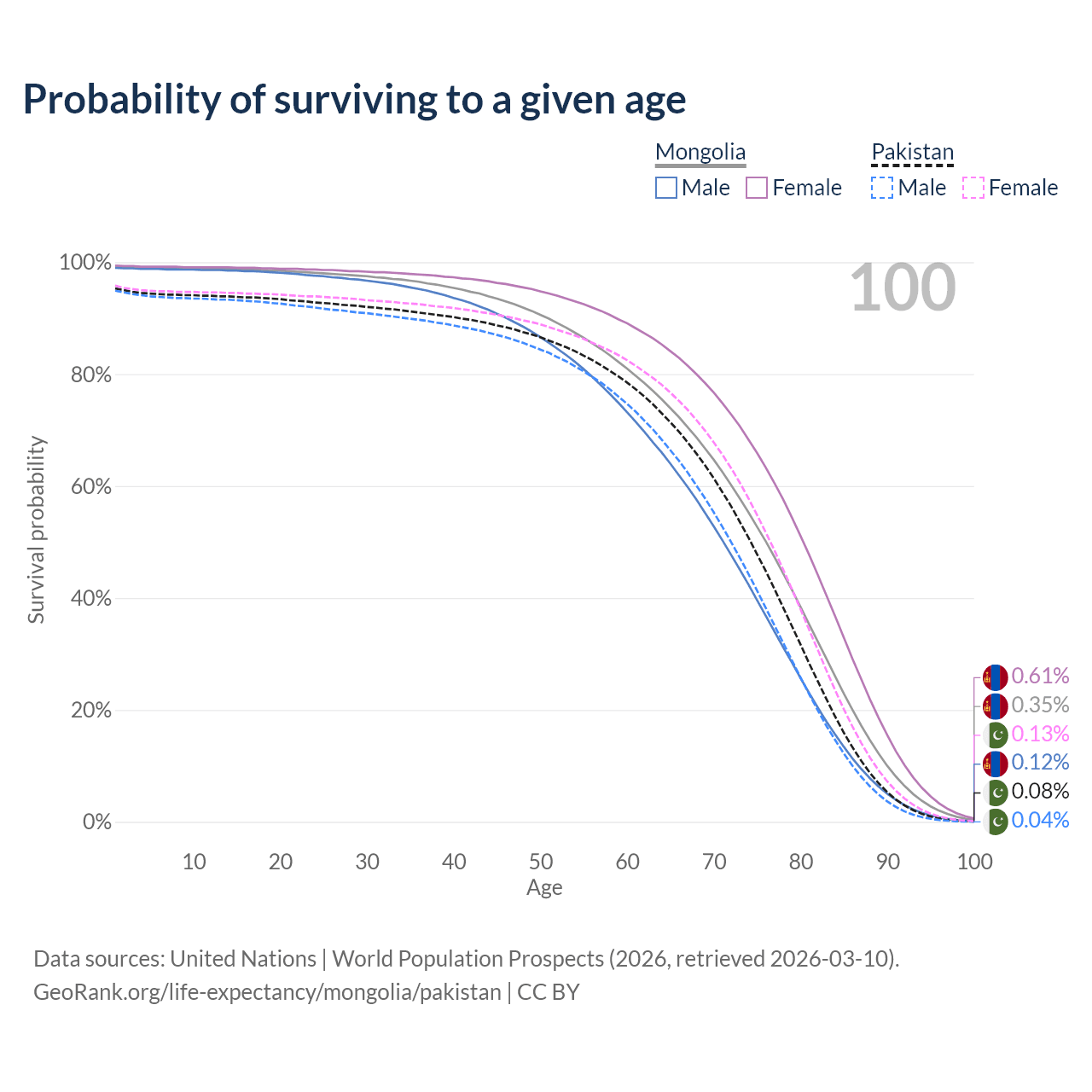 This life expectancy calculator shows the odds of living to 100, 95, 90, and below based on current age for both males and females in Mongolia and Pakistan, along with mean and median age of death. The calculations are based on the 2026 life tables (actuarial tables) from the UN World Population Prospects.