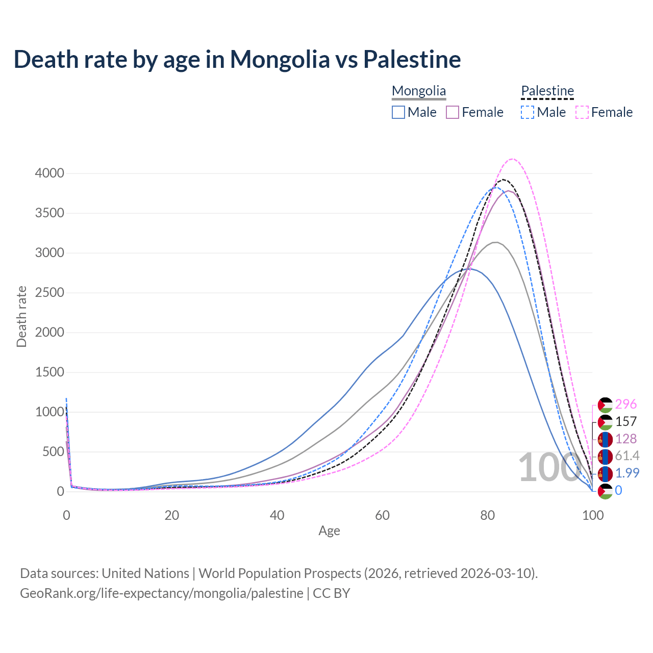 In Mongolia, the most common age of death is 82, compared to 83 in Palestine. The median age of death is 76 in Mongolia and 80.5 in Palestine, meaning only half of each cohort is expected to live past that age.