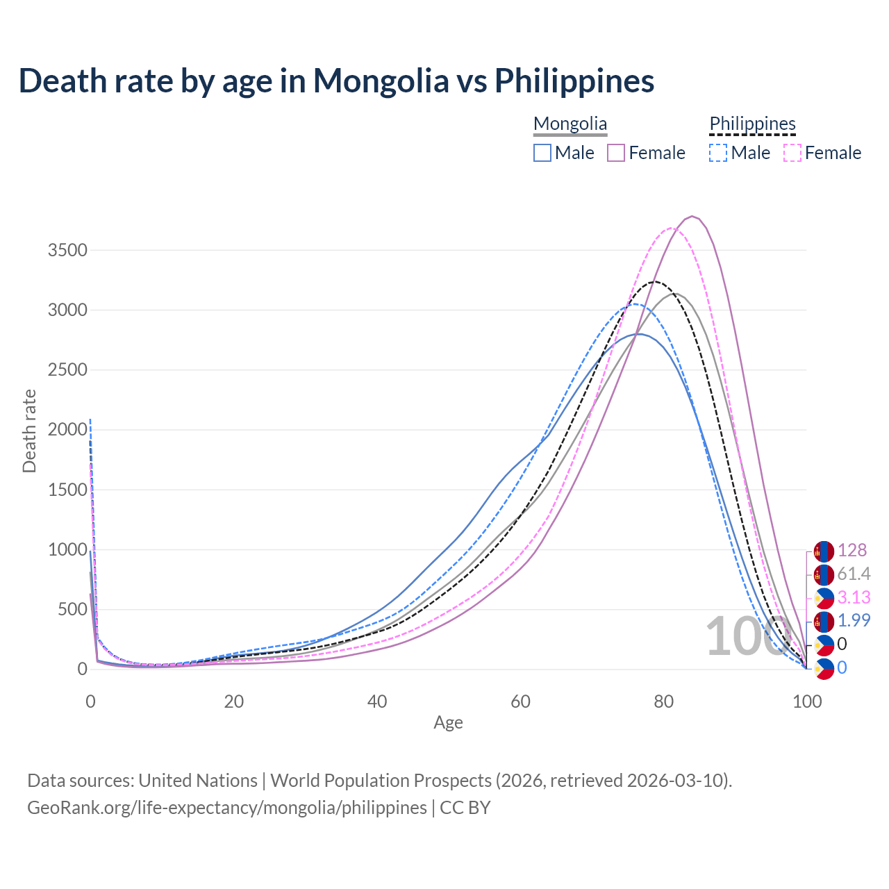 In Mongolia, the most common age of death is 82, compared to 79 in the Philippines. The median age of death is 76 in Mongolia and 74.6 in the Philippines, meaning only half of each cohort is expected to live past that age.