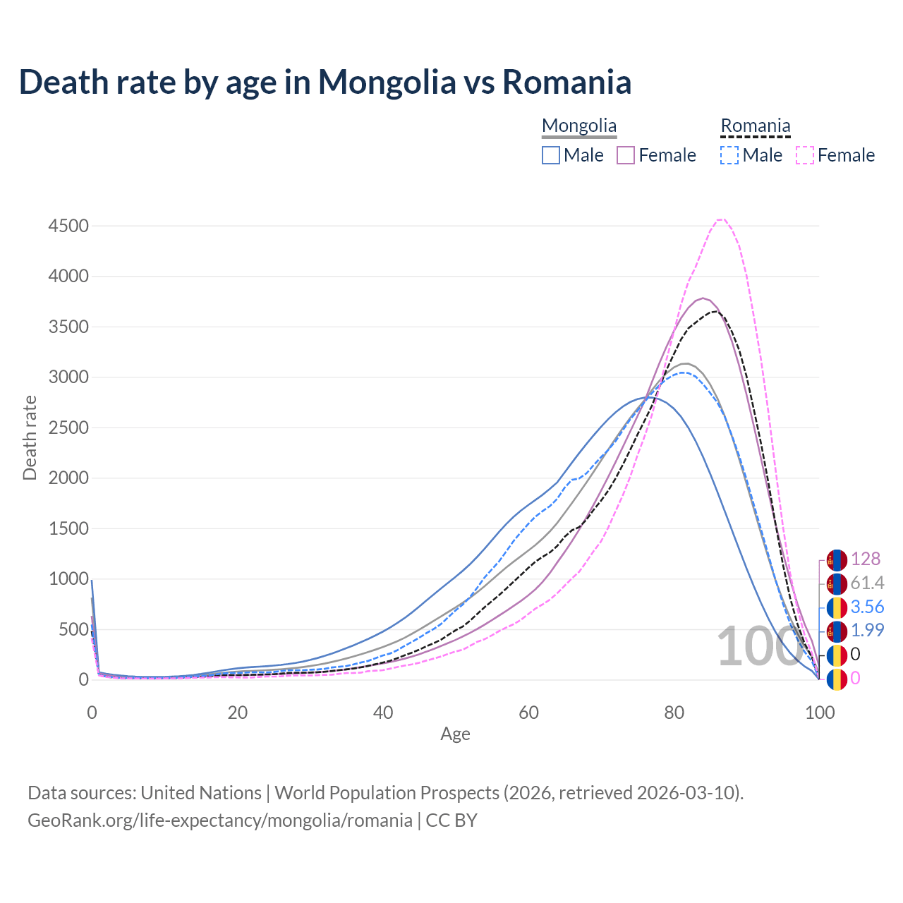 This life expectancy calculator shows the odds of living to 100, 95, 90, and below based on current age for both males and females in Mongolia and Romania, along with mean and median age of death. The calculations are based on the 2026 life tables (actuarial tables) from the UN World Population Prospects.
