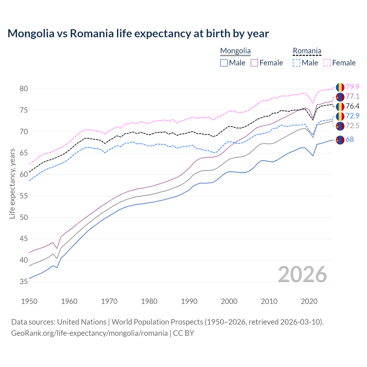 The average life expectancy at birth is 72.5 years in Mongolia vs 76.4 in Romania. Mongolia is ranked 120/197 by life expectancy, and Romania is 81/197. In Mongolia, the life expectancy is 68 years for males and 77.1 years for females. In Romania, it's 72.9 years for males and 79.9 years for females.