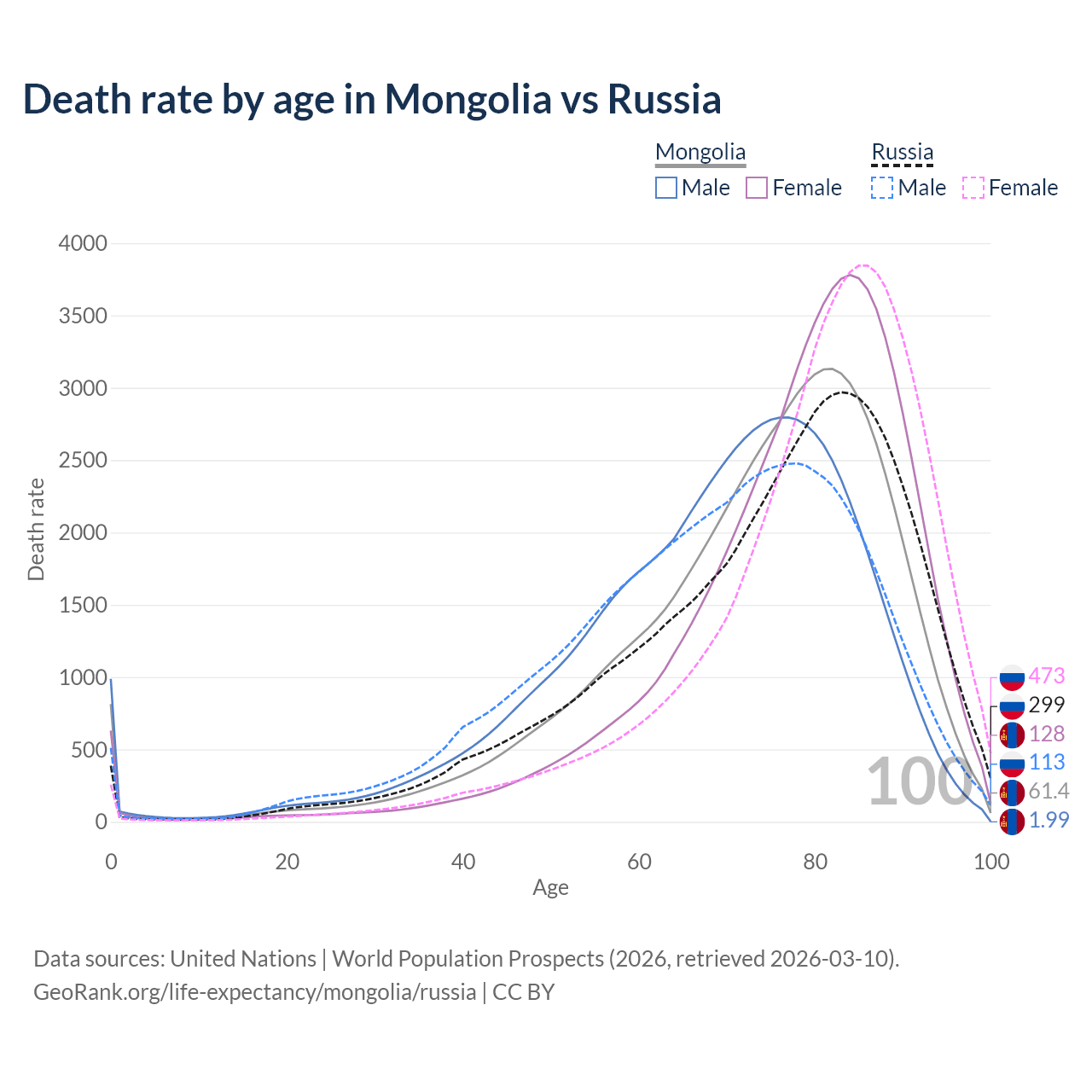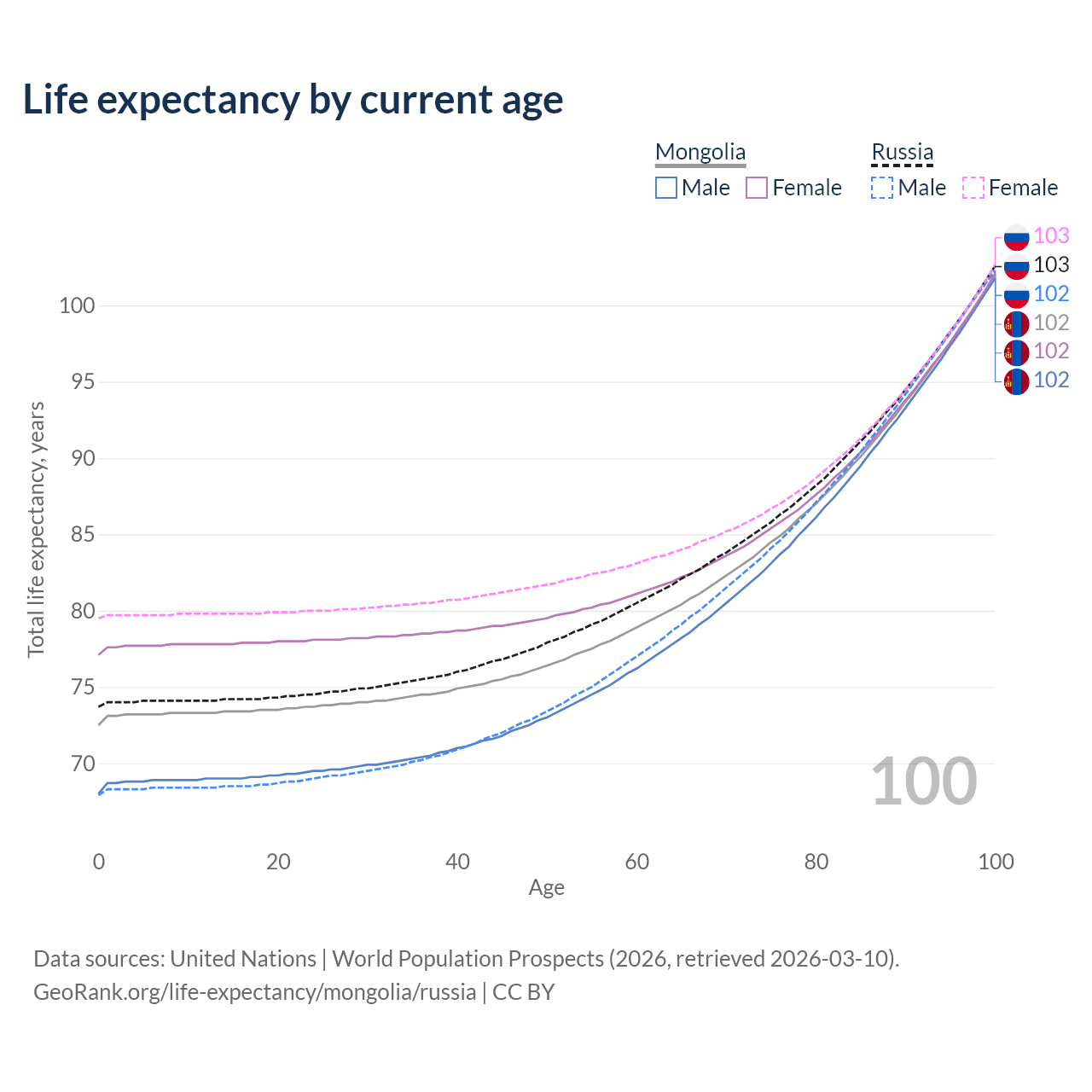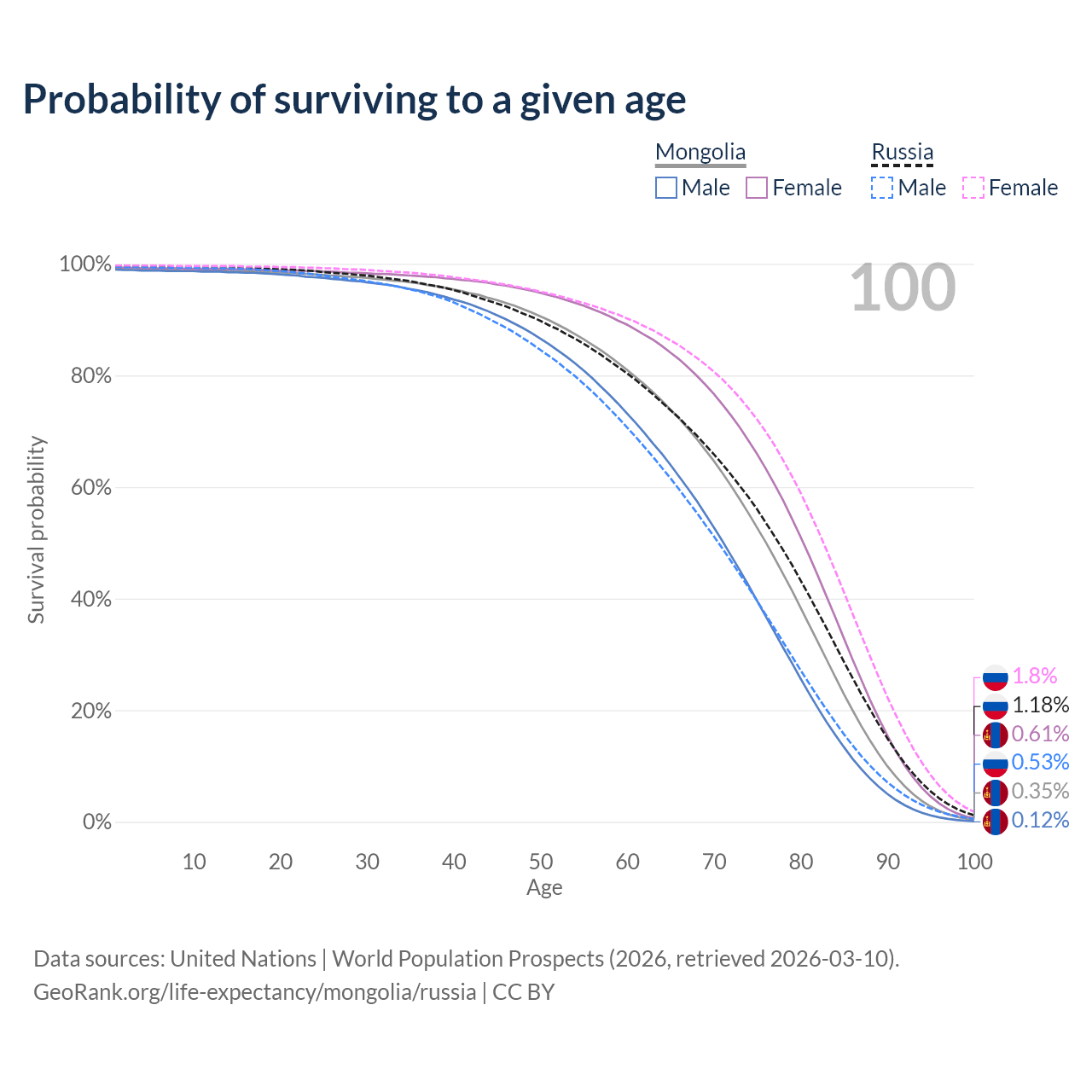 This life expectancy calculator shows the odds of living to 100, 95, 90, and below based on current age for both males and females in Mongolia and Russia, along with mean and median age of death. The calculations are based on the 2026 life tables (actuarial tables) from the UN World Population Prospects.