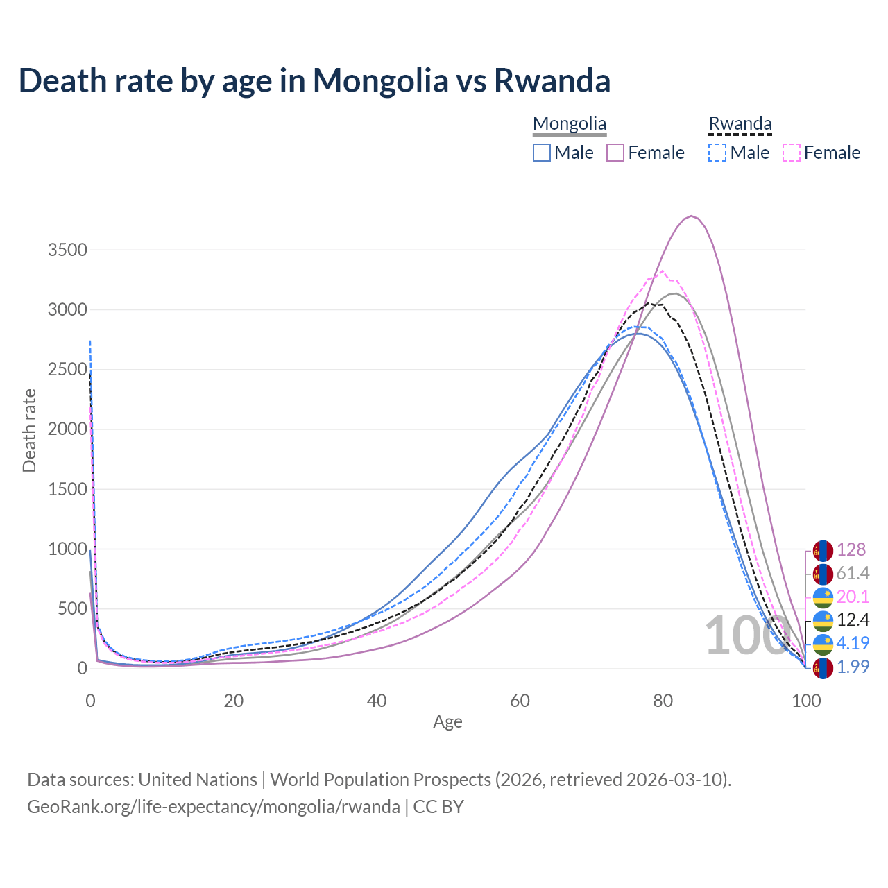 In Mongolia, the most common age of death is 82, compared to 78 in Rwanda. The median age of death is 76 in Mongolia and 73.5 in Rwanda, meaning only half of each cohort is expected to live past that age.