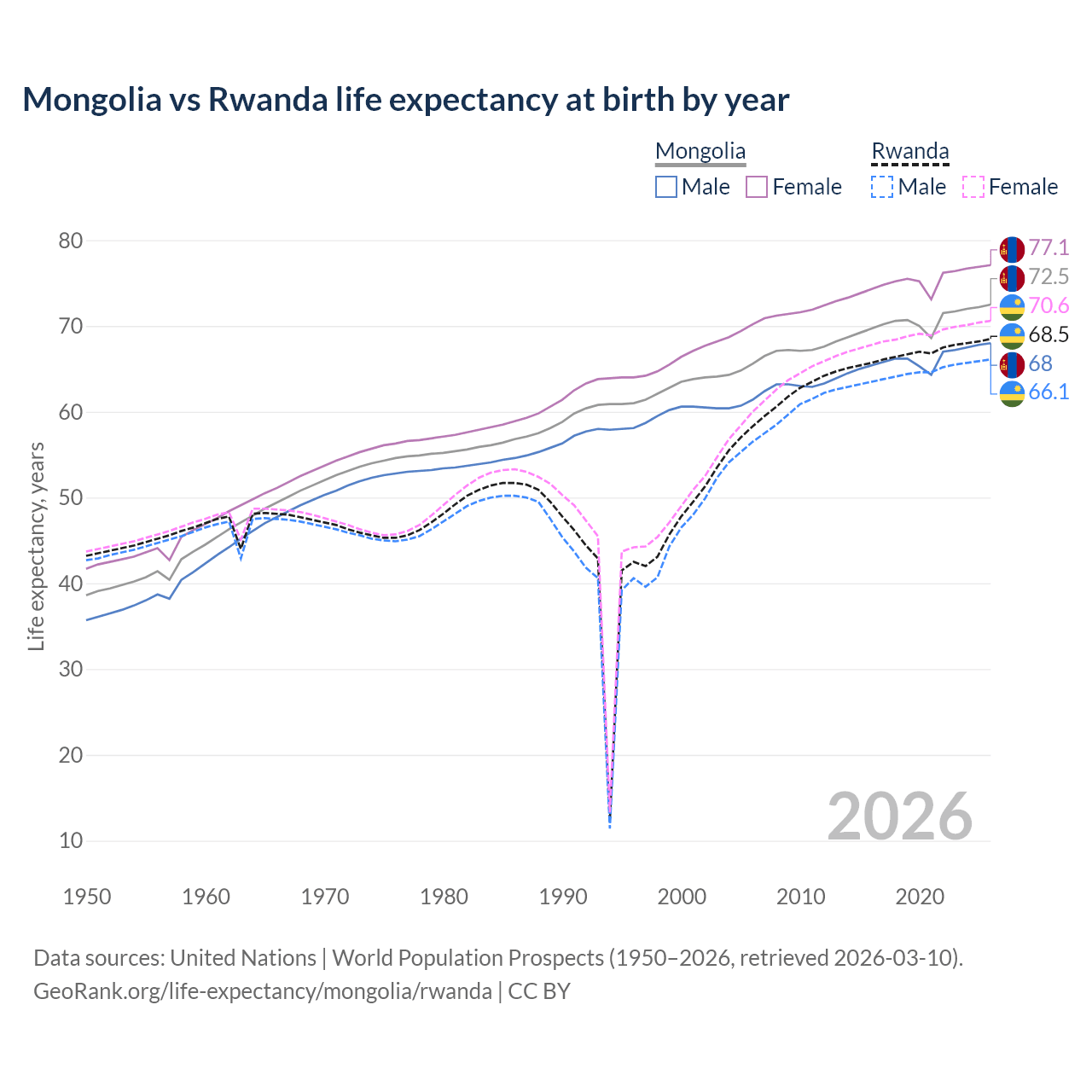 The average life expectancy at birth is 72.5 years in Mongolia vs 68.5 in Rwanda. Mongolia is ranked 120/197 by life expectancy, and Rwanda is 148/197. In Mongolia, the life expectancy is 68 years for males and 77.1 years for females. In Rwanda, it's 66.1 years for males and 70.6 years for females.