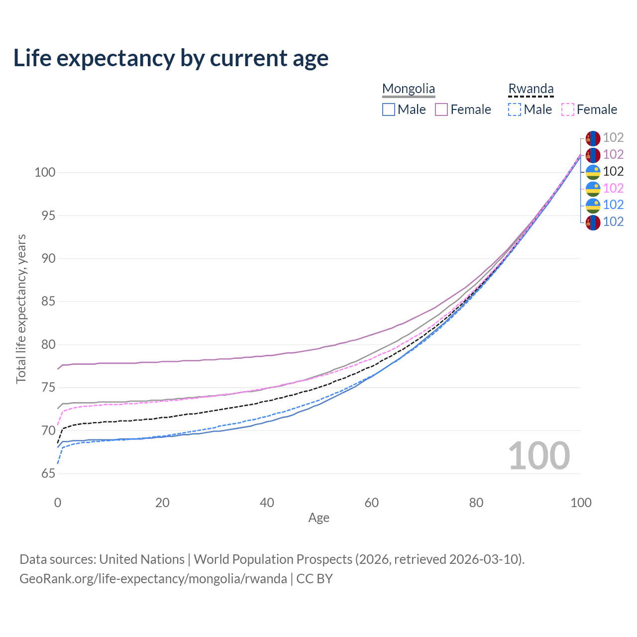 This life expectancy calculator shows the odds of living to 100, 95, 90, and below based on current age for both males and females in Mongolia and Rwanda, along with mean and median age of death. The calculations are based on the 2026 life tables (actuarial tables) from the UN World Population Prospects.
