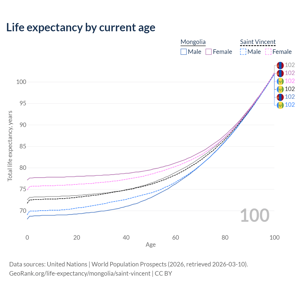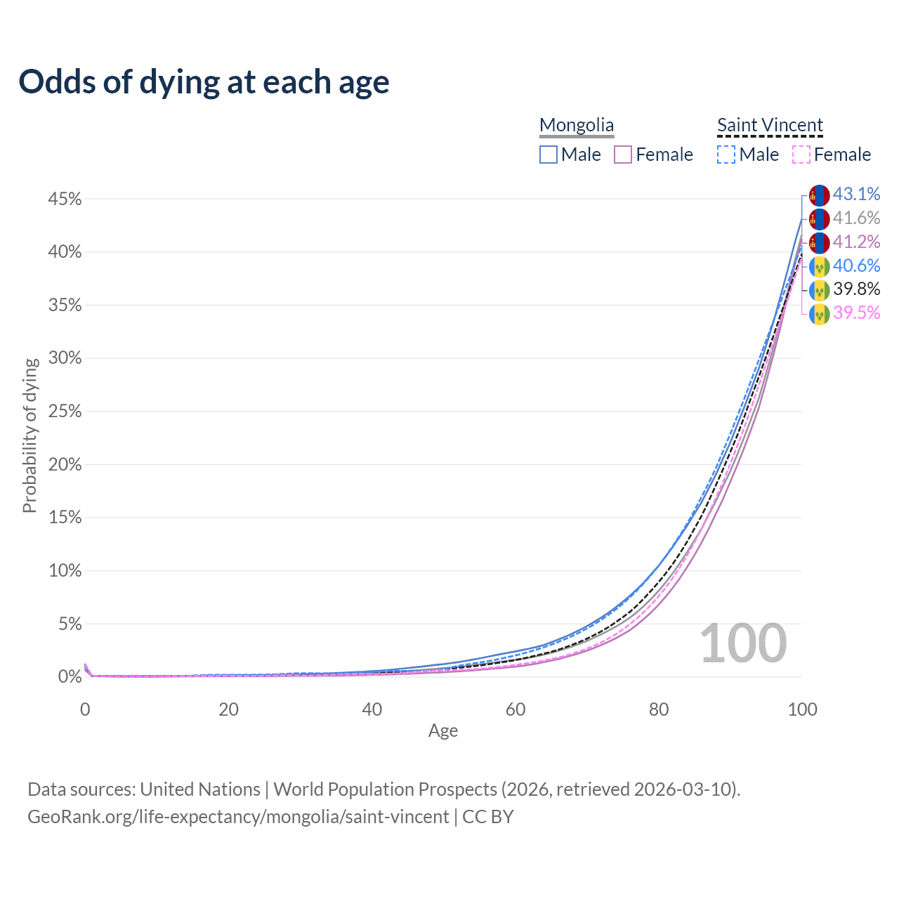 This life expectancy calculator shows the odds of living to 100, 95, 90, and below based on current age for both males and females in Mongolia and Saint Vincent, along with mean and median age of death. The calculations are based on the 2026 life tables (actuarial tables) from the UN World Population Prospects.