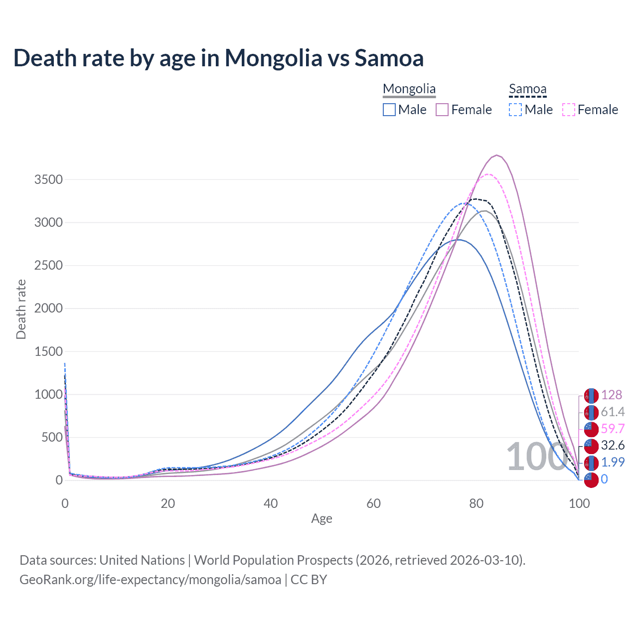 In Mongolia, the most common age of death is 82, compared to 80 in Samoa. The median age of death is 76 in Mongolia and 75.9 in Samoa, meaning only half of each cohort is expected to live past that age.