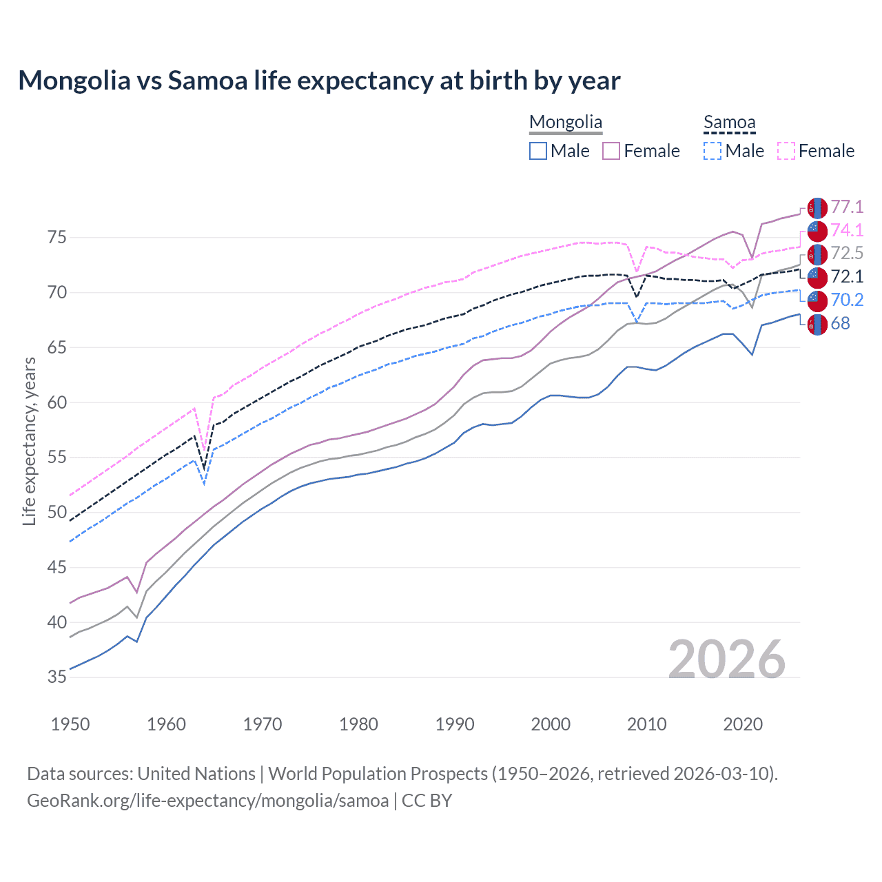 The average life expectancy at birth is 72.5 years in Mongolia vs 72.1 in Samoa. Mongolia is ranked 120/197 by life expectancy, and Samoa is 124/197. In Mongolia, the life expectancy is 68 years for males and 77.1 years for females. In Samoa, it's 70.2 years for males and 74.1 years for females.