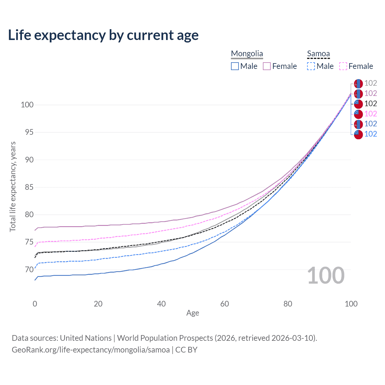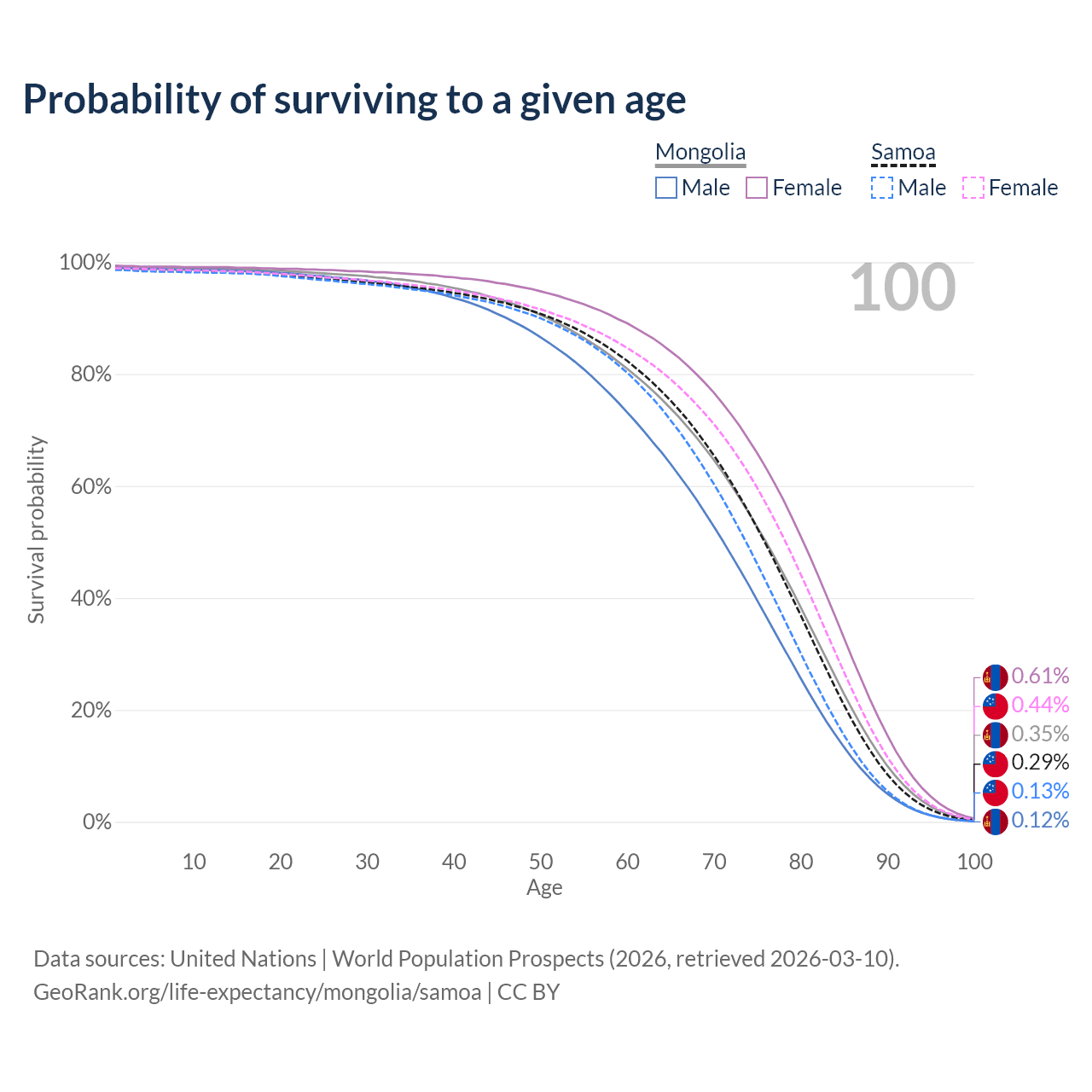 This life expectancy calculator shows the odds of living to 100, 95, 90, and below based on current age for both males and females in Mongolia and Samoa, along with mean and median age of death. The calculations are based on the 2026 life tables (actuarial tables) from the UN World Population Prospects.