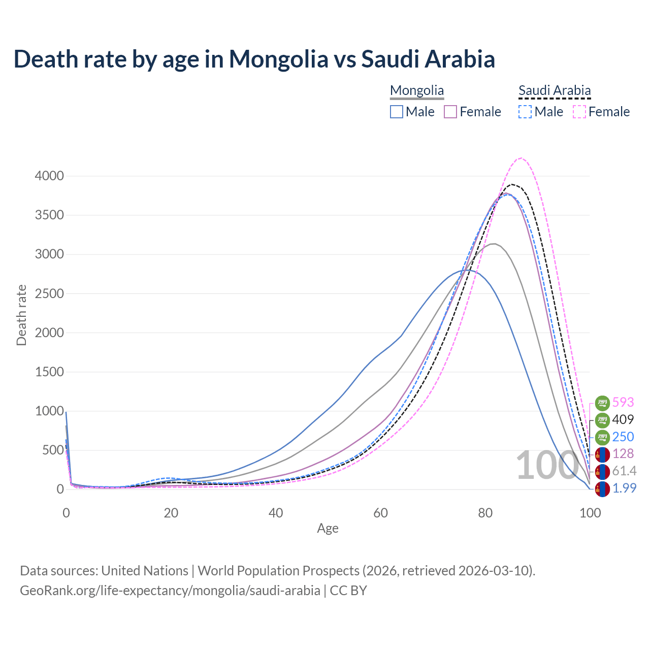 In Mongolia, the most common age of death is 82, compared to 85 in Saudi Arabia. The median age of death is 76 in Mongolia and 82.5 in Saudi Arabia, meaning only half of each cohort is expected to live past that age.