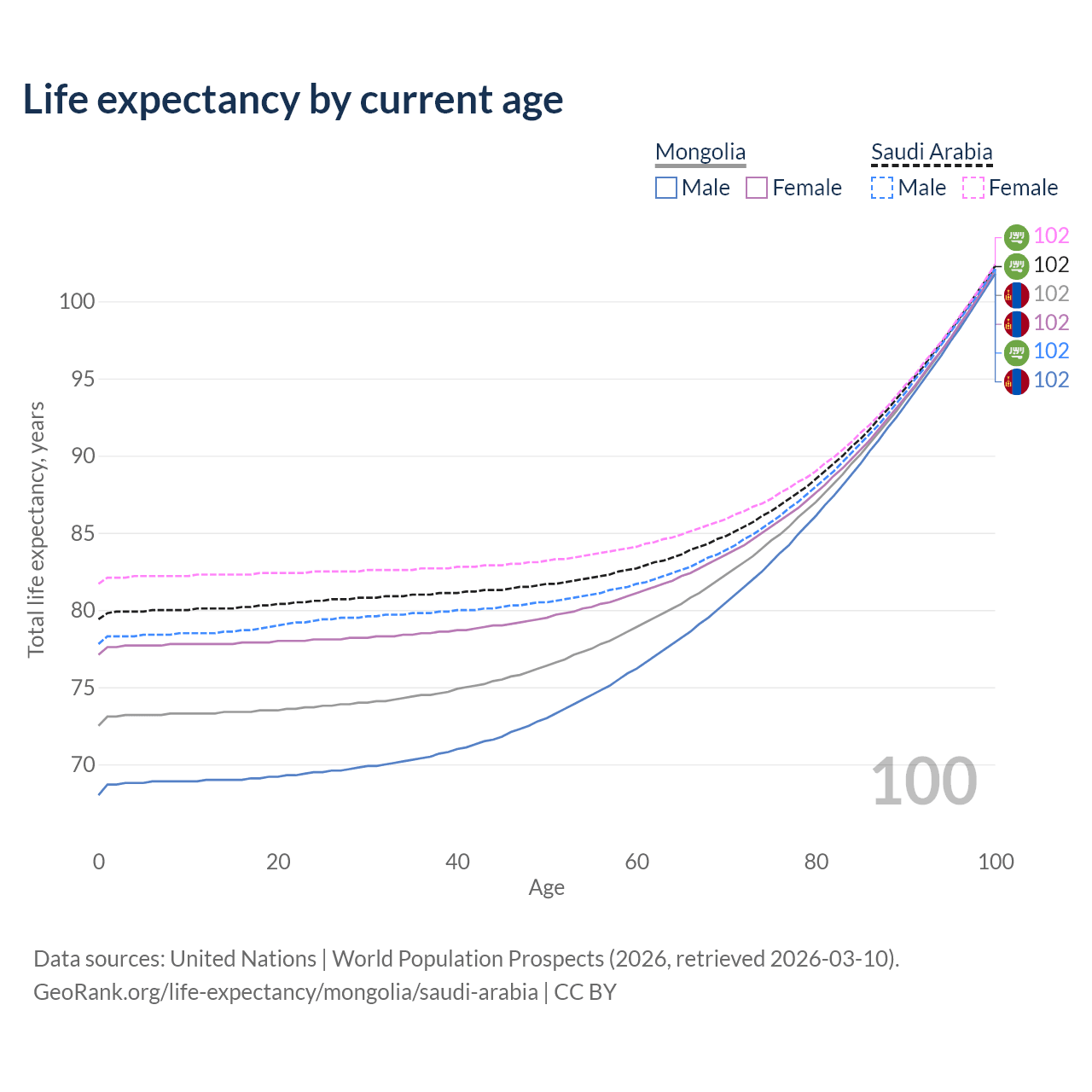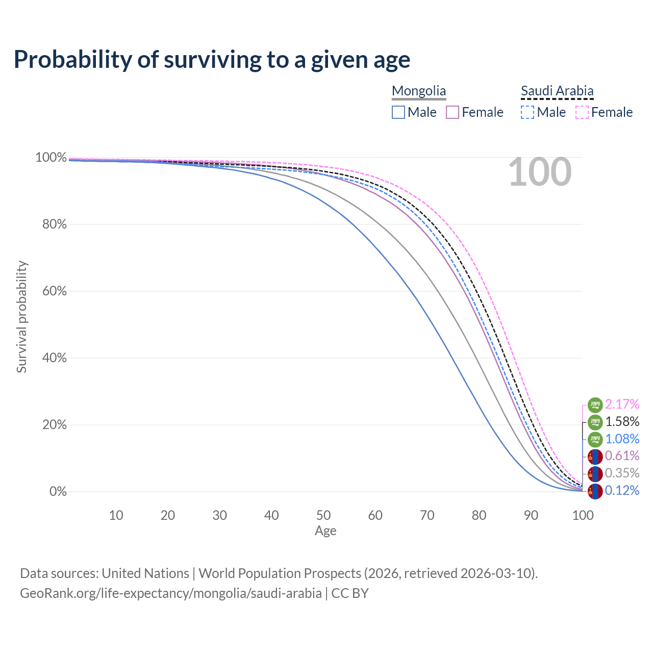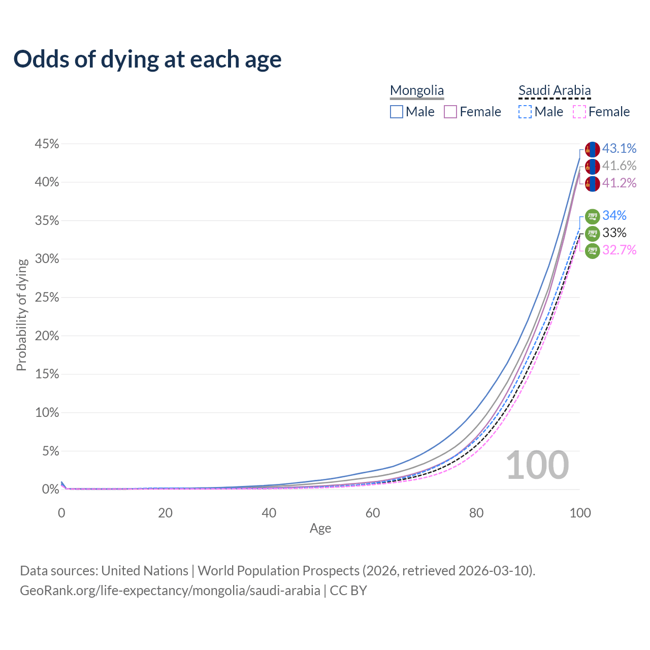 This life expectancy calculator shows the odds of living to 100, 95, 90, and below based on current age for both males and females in Mongolia and Saudi Arabia, along with mean and median age of death. The calculations are based on the 2026 life tables (actuarial tables) from the UN World Population Prospects.