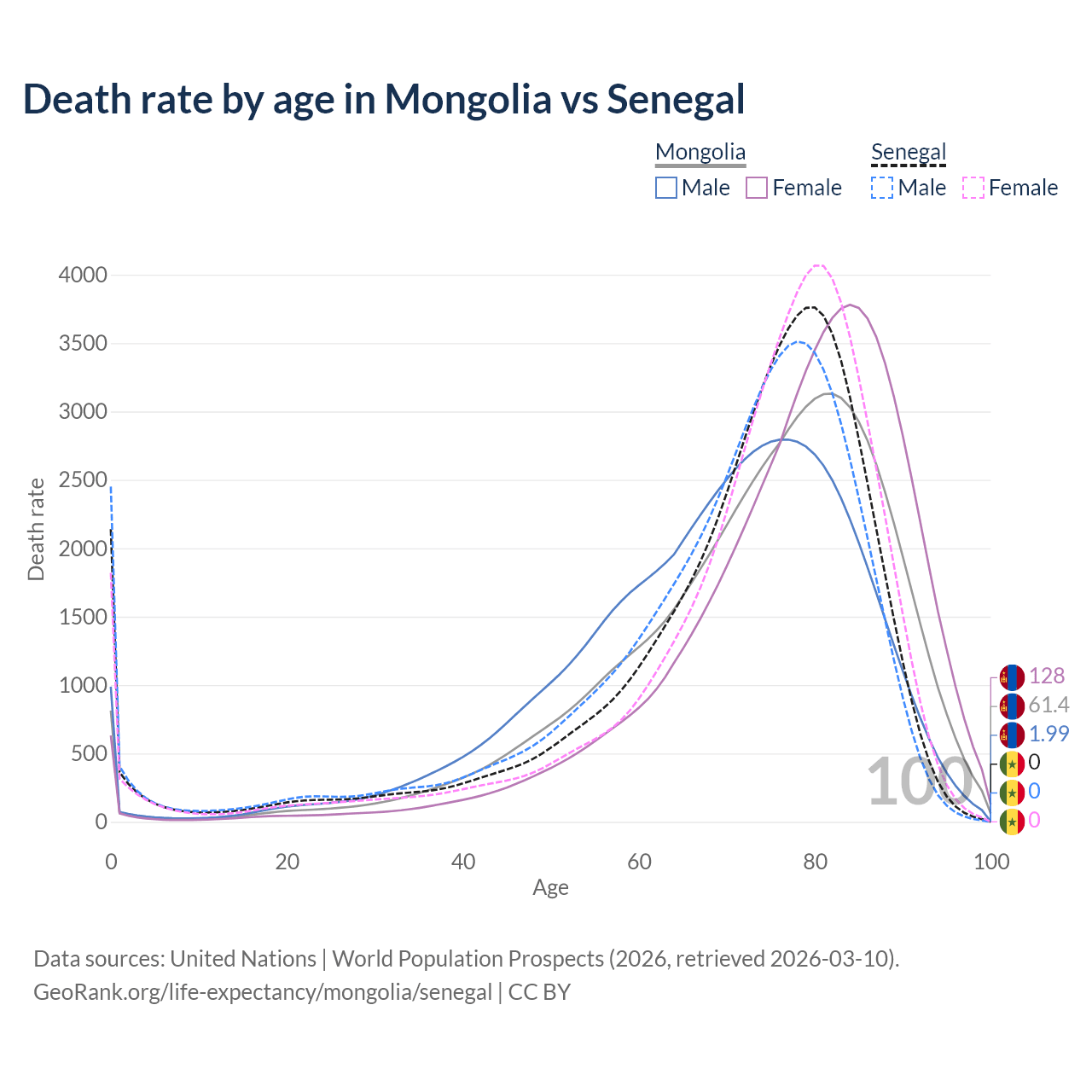 In Mongolia, the most common age of death is 82, compared to 80 in Senegal. The median age of death is 76 in Mongolia and 75 in Senegal, meaning only half of each cohort is expected to live past that age.