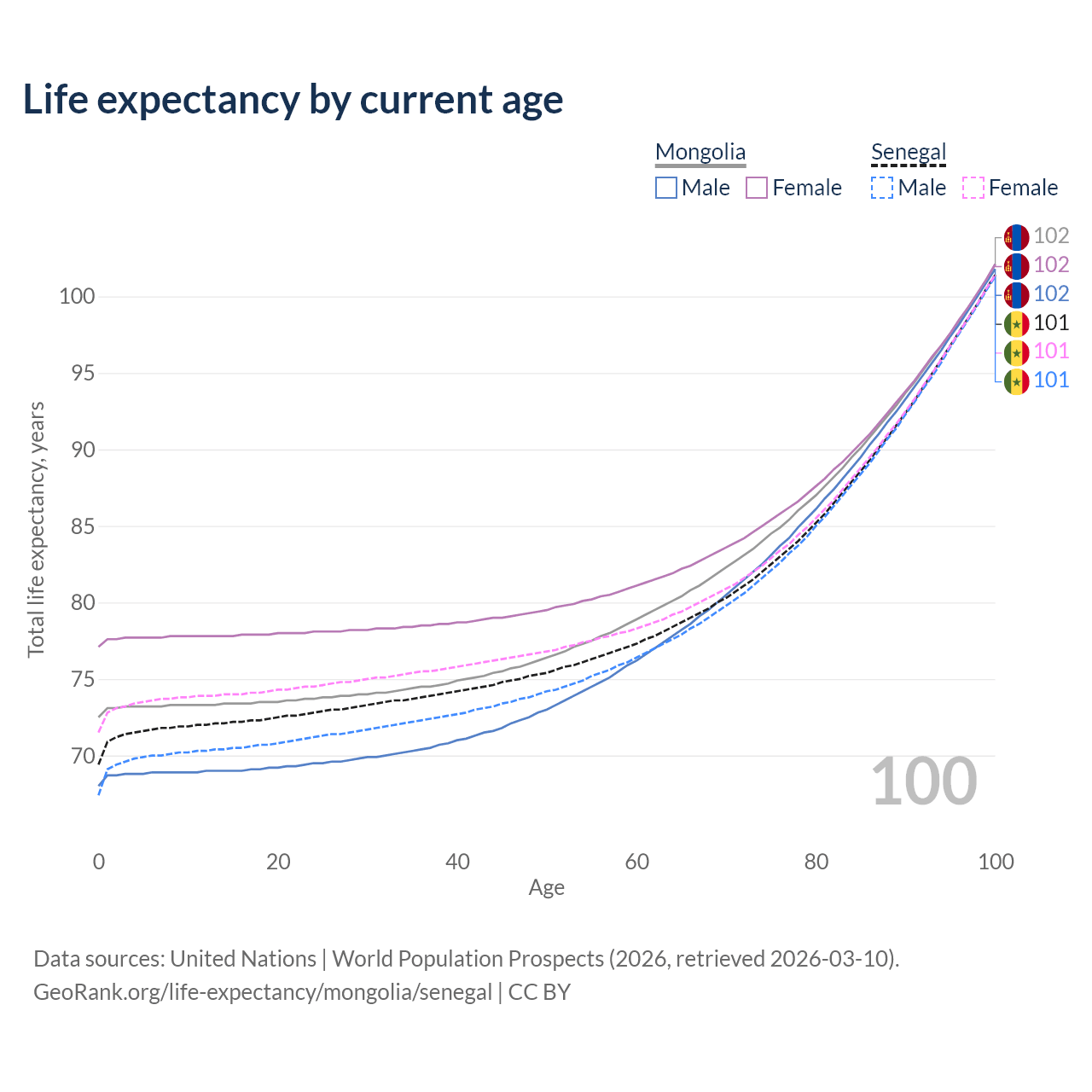 This life expectancy calculator shows the odds of living to 100, 95, 90, and below based on current age for both males and females in Mongolia and Senegal, along with mean and median age of death. The calculations are based on the 2026 life tables (actuarial tables) from the UN World Population Prospects.