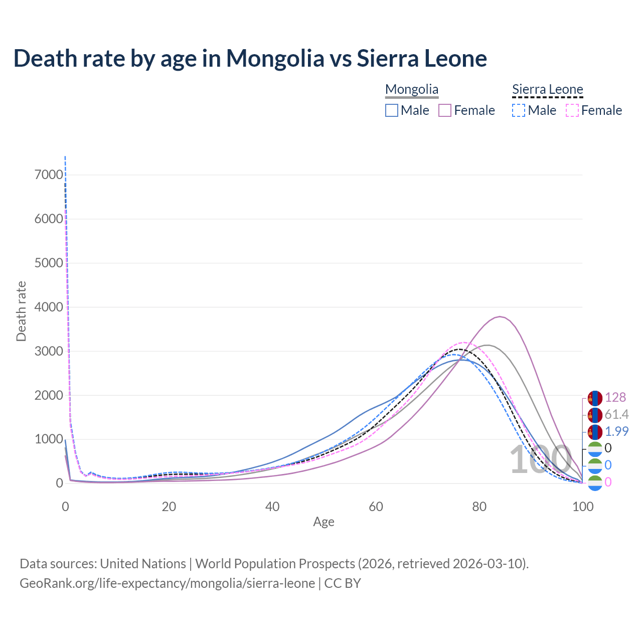 In Mongolia, the most common age of death is 82, compared to 0 in Sierra Leone. The median age of death is 76 in Mongolia and 70.8 in Sierra Leone, meaning only half of each cohort is expected to live past that age.