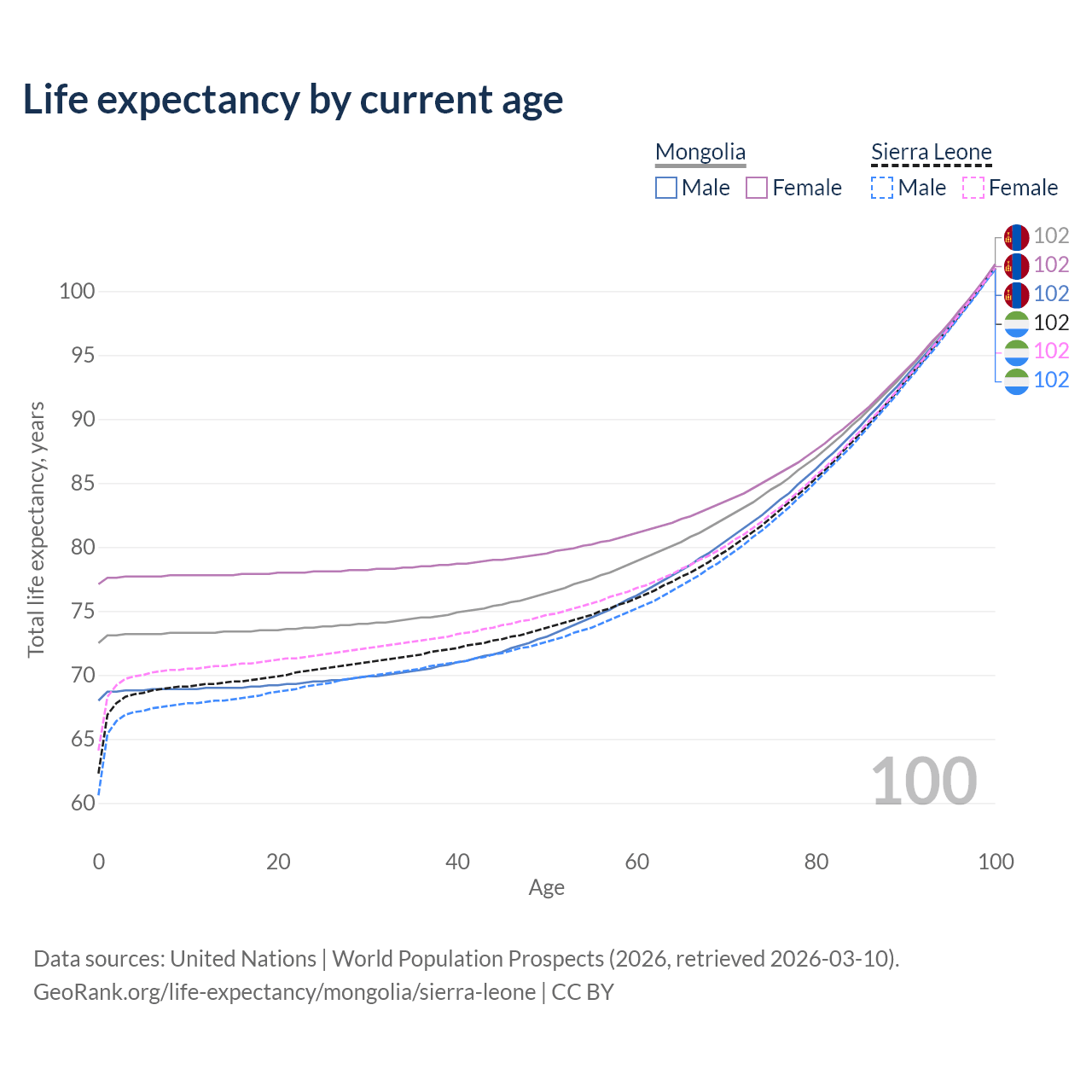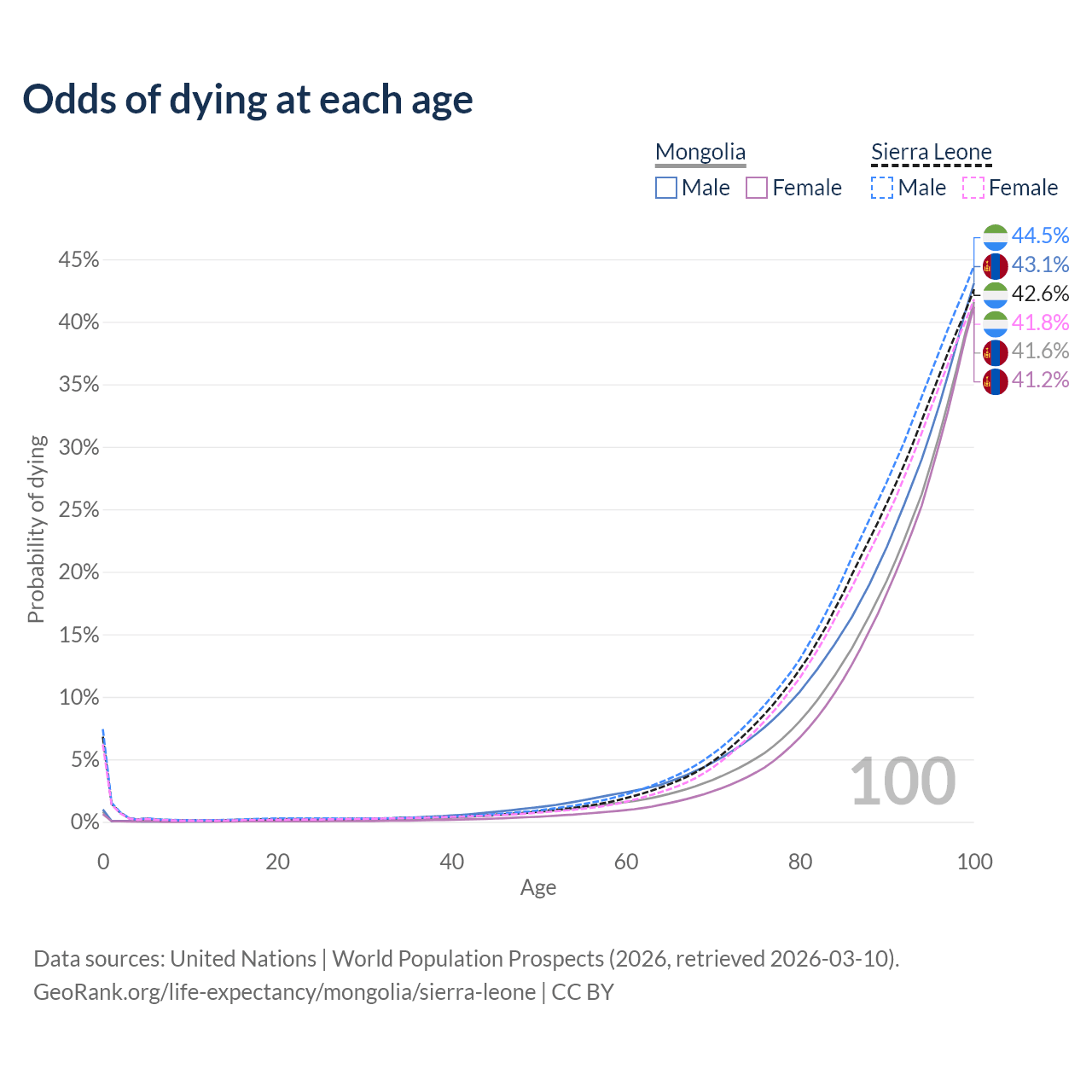 This life expectancy calculator shows the odds of living to 100, 95, 90, and below based on current age for both males and females in Mongolia and Sierra Leone, along with mean and median age of death. The calculations are based on the 2026 life tables (actuarial tables) from the UN World Population Prospects.