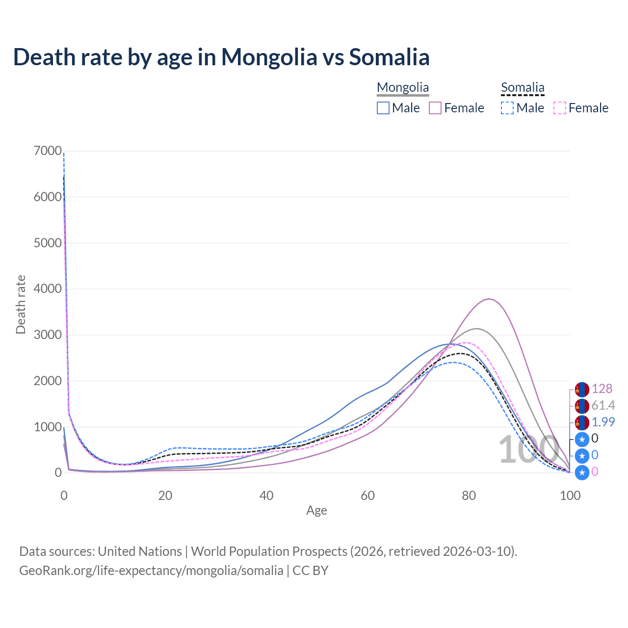 In Mongolia, the most common age of death is 82, compared to 0 in Somalia. The median age of death is 76 in Mongolia and 69 in Somalia, meaning only half of each cohort is expected to live past that age.