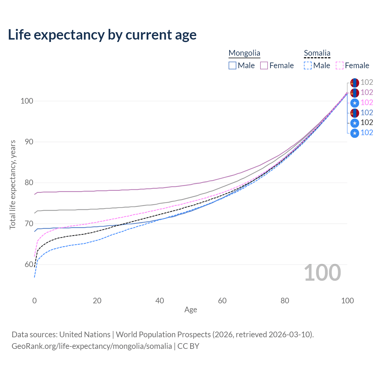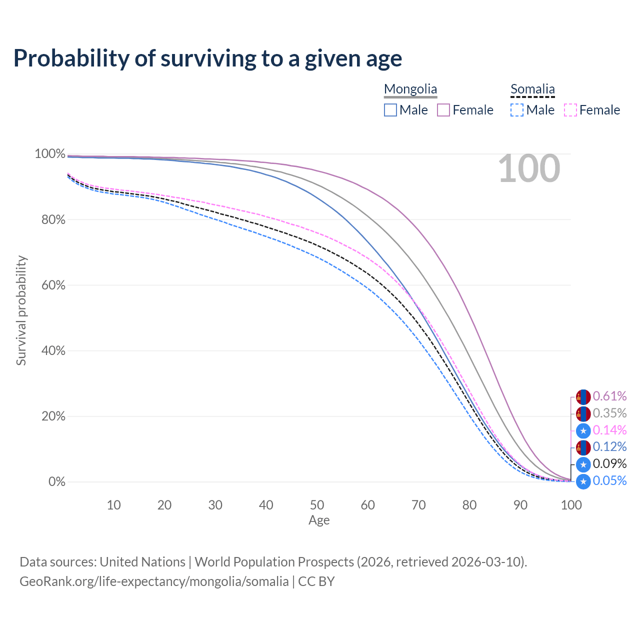 This life expectancy calculator shows the odds of living to 100, 95, 90, and below based on current age for both males and females in Mongolia and Somalia, along with mean and median age of death. The calculations are based on the 2026 life tables (actuarial tables) from the UN World Population Prospects.