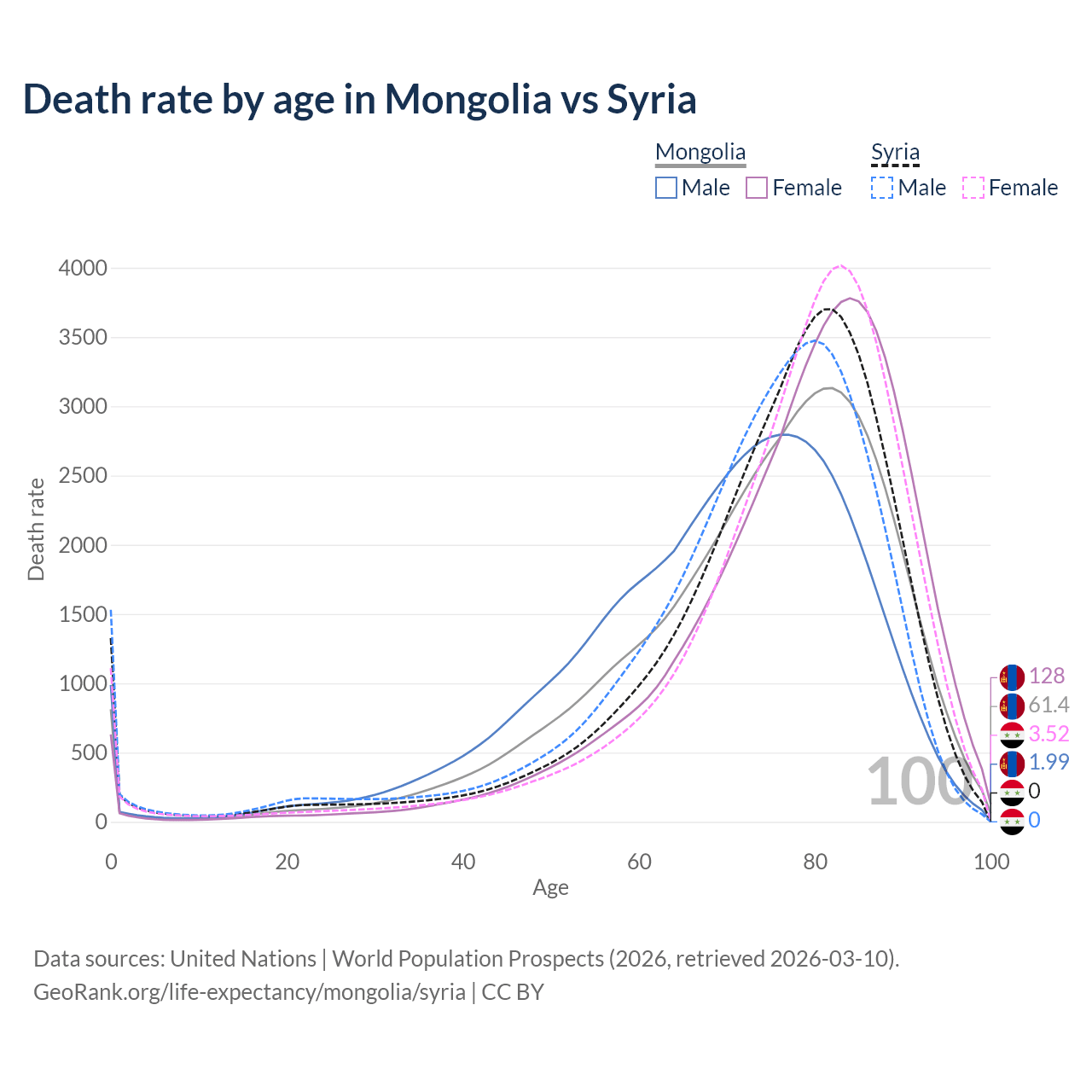 This life expectancy calculator shows the odds of living to 100, 95, 90, and below based on current age for both males and females in Mongolia and Syria, along with mean and median age of death. The calculations are based on the 2026 life tables (actuarial tables) from the UN World Population Prospects.