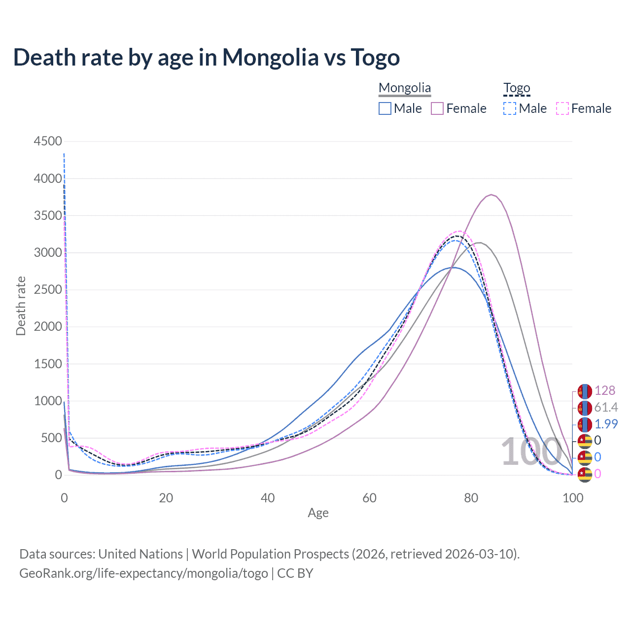 In Mongolia, the most common age of death is 82, compared to 0 in Togo. The median age of death is 76 in Mongolia and 71 in Togo, meaning only half of each cohort is expected to live past that age.