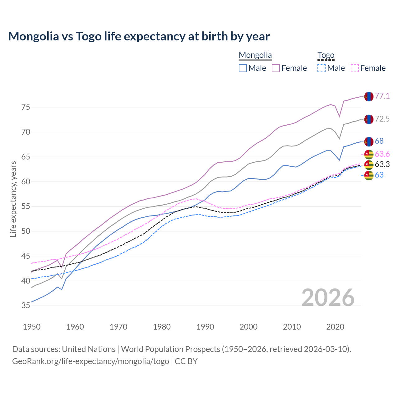 The average life expectancy at birth is 72.5 years in Mongolia vs 63.3 in Togo. Mongolia is ranked 120/197 by life expectancy, and Togo is 181/197. In Mongolia, the life expectancy is 68 years for males and 77.1 years for females. In Togo, it's 63 years for males and 63.6 years for females.