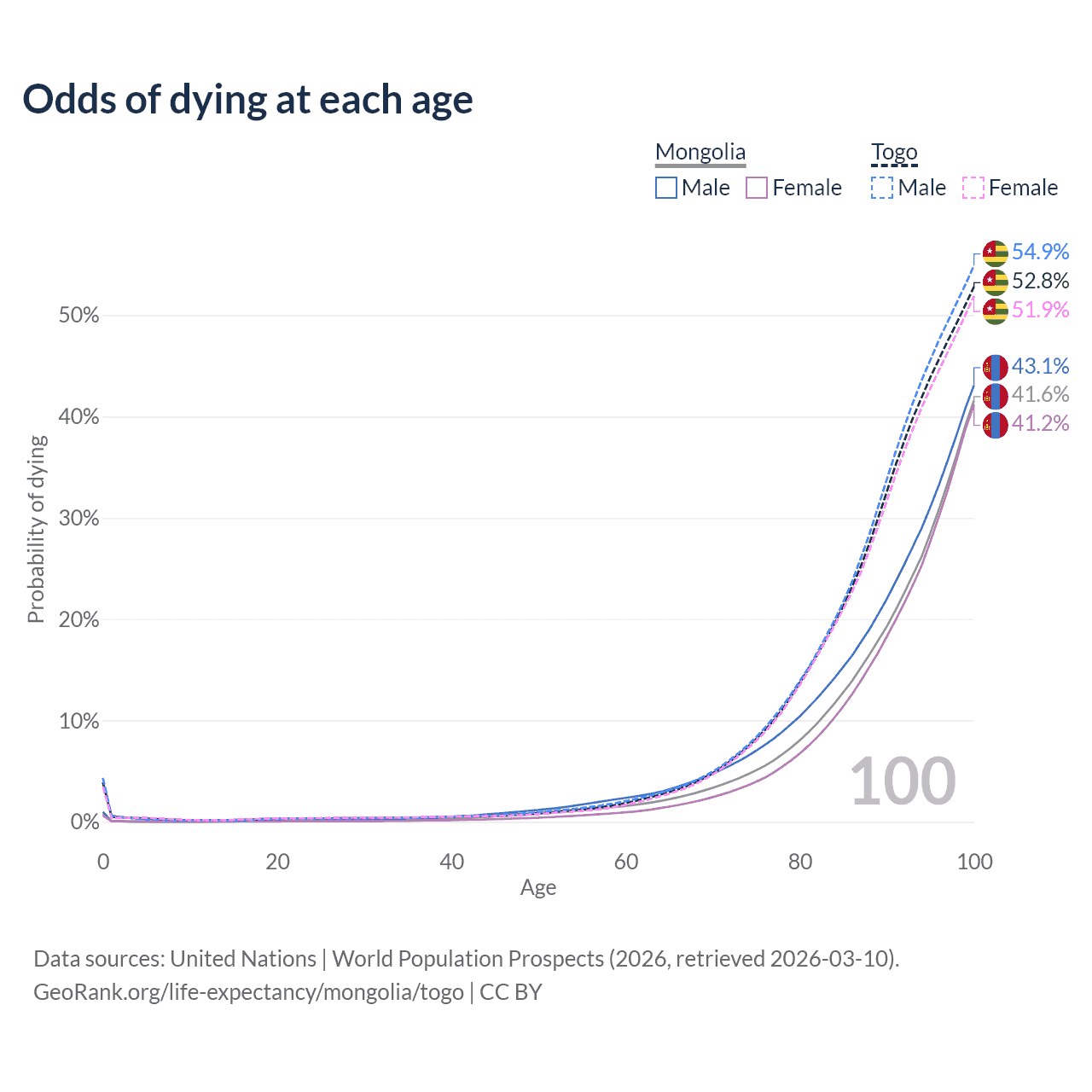 This life expectancy calculator shows the odds of living to 100, 95, 90, and below based on current age for both males and females in Mongolia and Togo, along with mean and median age of death. The calculations are based on the 2026 life tables (actuarial tables) from the UN World Population Prospects.