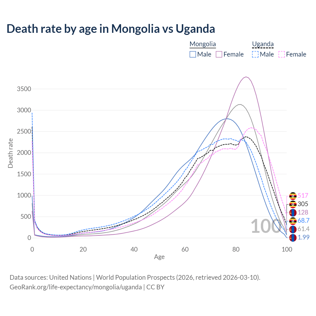 In Mongolia, the most common age of death is 82, compared to 0 in Uganda. The median age of death is 76 in Mongolia and 73.3 in Uganda, meaning only half of each cohort is expected to live past that age.
