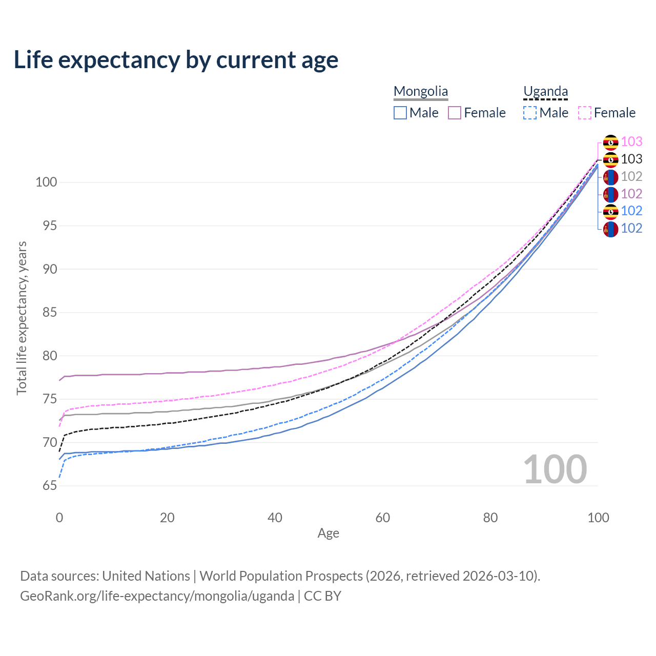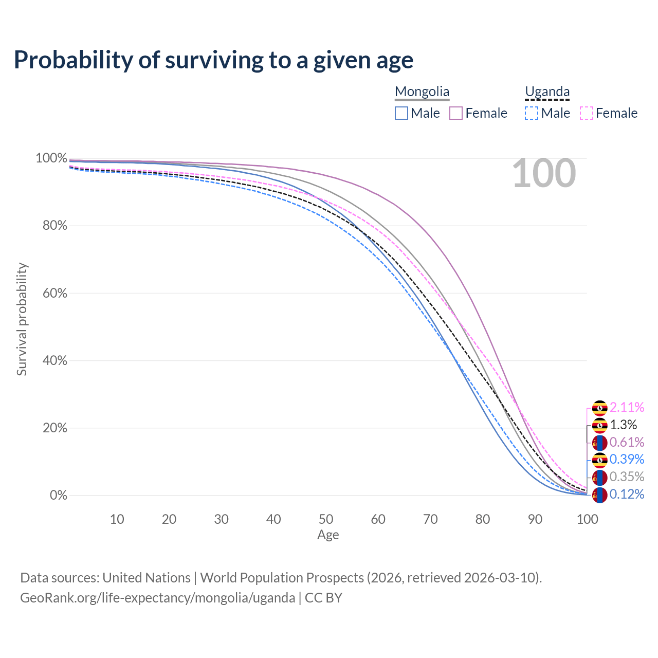 This life expectancy calculator shows the odds of living to 100, 95, 90, and below based on current age for both males and females in Mongolia and Uganda, along with mean and median age of death. The calculations are based on the 2026 life tables (actuarial tables) from the UN World Population Prospects.
